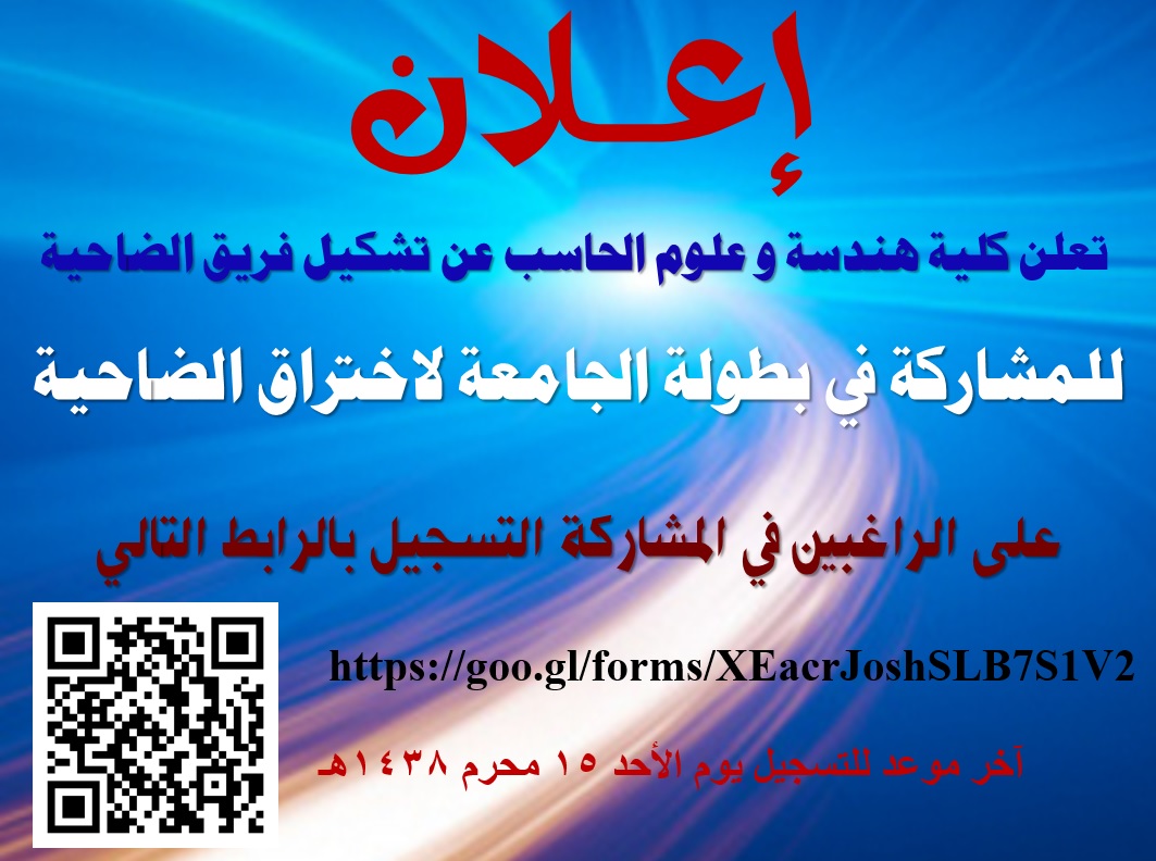 إعــــلان    تعلن كلية هندسة و علوم الحاسب عن تشكيل فريق الضاحية   للمشاركة في بطولة الجامعة لاختراق الضاحية   على الراغبين في المشاركة التسجيل هنا   آخر موعد للتسجيل يوم الأحد 15 محرم 1438هـ