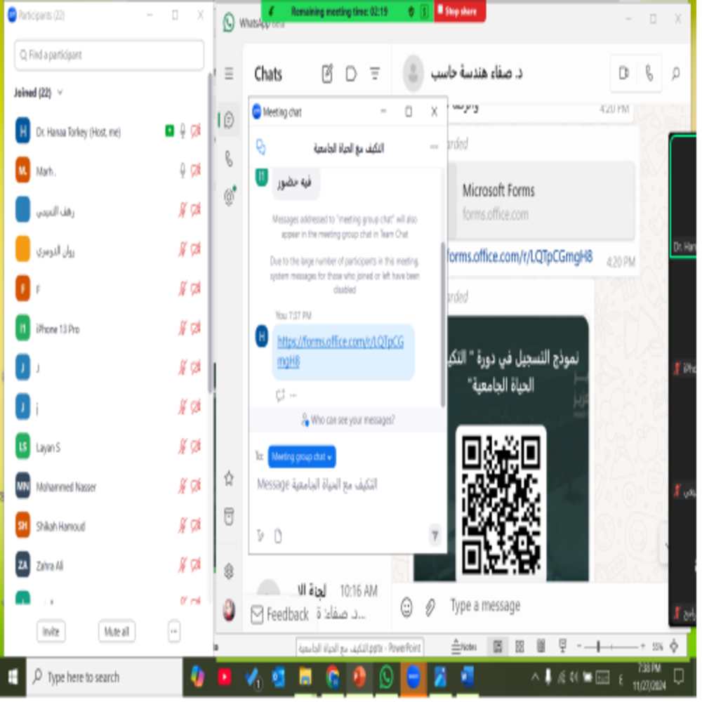 عُقدت المحاضرة يوم الأربعاء 27 نوفمبر 2024 في تمام الساعة السابعة مساءً عبر منصة zoom قدمتها د. هناء ابو العينين .