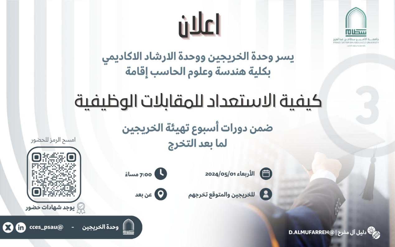 نظمت وحدة الخريجين ووحدة الإرشاد الأكاديمي بكلية هندسة وعلوم الحاسب دورة تدريبية بعنوان (كيفية الاستعداد للمقابلات الوظيفية ) ضمن دورات أسبوع تهيئة الخريجين لما بعد التخرج من تقدبم أ. ريما سعود العتيبي – خريجة كلية هندسة وعلوم الحاسب تخصص علوم الحاسب مختص إدارة وتحليل في قطاع الاستراتيجية برنامج تطوير الحرس الوطني وتم عقد الدورة عن بعد عبر (البلاك بورد) وذلك مساء يوم الاربعاء الموافق 1مايو 2024م الساعة 7 مساءً، وبحضور (40) من الطلبة الخريجين والمتوقع تخرجهم .