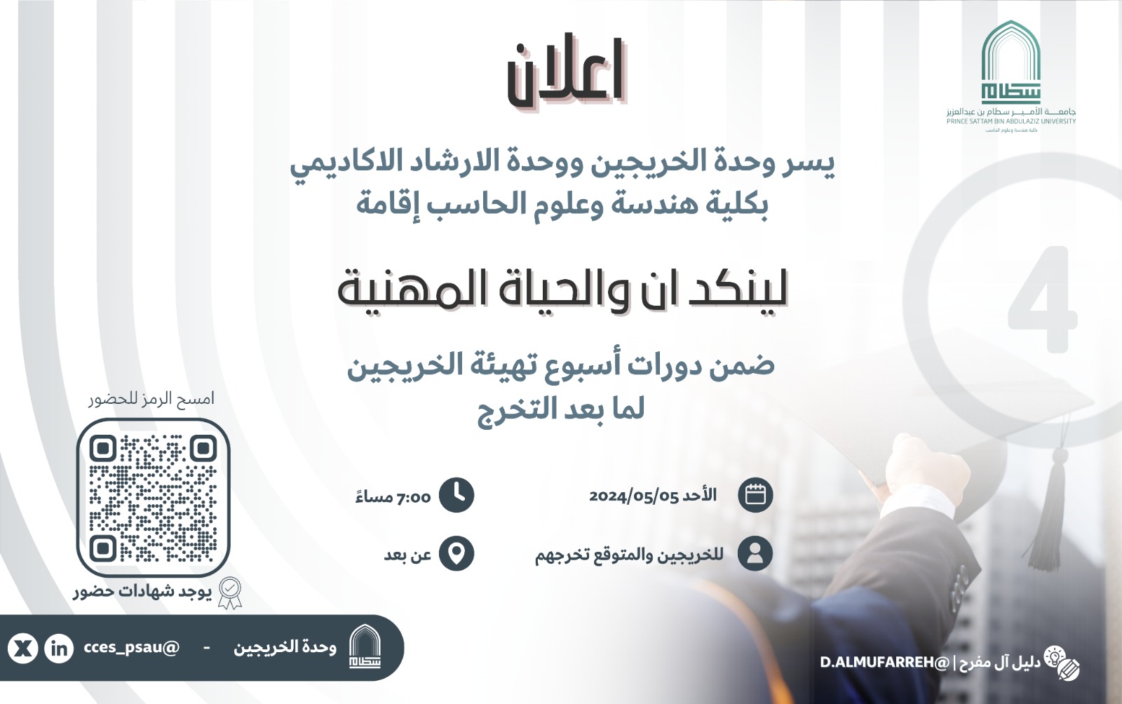 نظمت وحدة الخريجين ووحدة الإرشاد الأكاديمي بكلية هندسة وعلوم الحاسب دورة تدريبية بعنوان (لينكد ان والحياة المهنية ) ضمن دورات أسبوع تهيئة الخريجين لما بعد التخرج من تقدبم م. عبدالله الزهراني – خريج كلية هندسة وعلوم الحاسب تخصص هندسة حاسب مهندس الامن السبيراني وتم عقد الدورة عن بعد عبر (البلاك بورد) وذلك مساء يوم الأحد الموافق 5 مايو 2024م الساعة 7 مساءً، وبحضور (45) من الطلبة الخريجين والمتوقع تخرجهم .