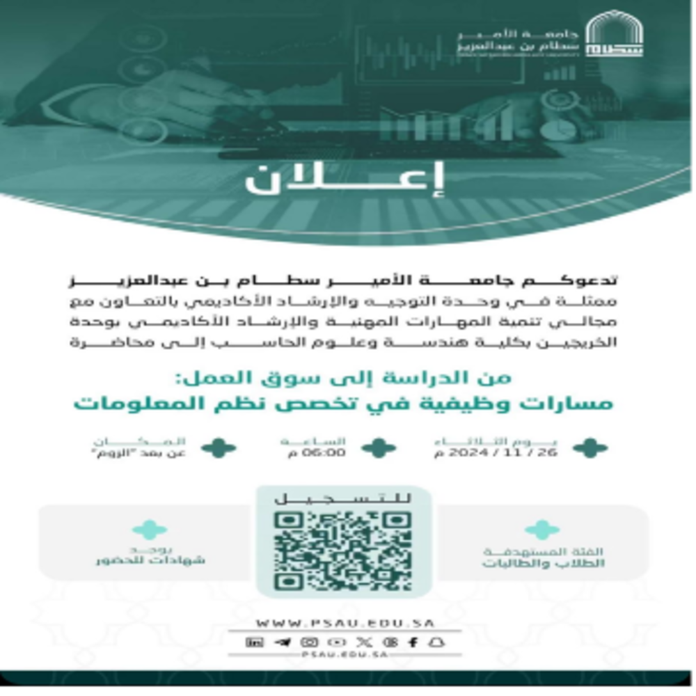 تحت إشراف وكالة الشؤون الأكاديمية بكلية هندسة وعلوم الحاسب نظّمت وحدة التوجيه والإرشاد الأكاديمي وبالتعاون مع مجالي تنمية المهارات المهنية ومشاريع التخرج بوحدة الخريجين ورشة افتراضية بعنوان "من الدراسة إلى سوق العمل - مسارات وظيفية في تخصص نظم المعلومات".