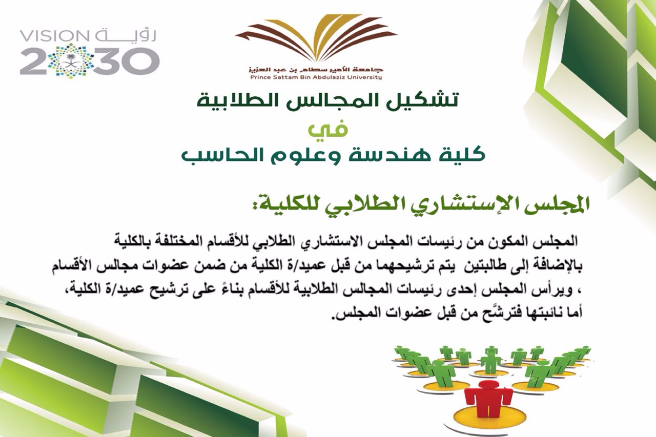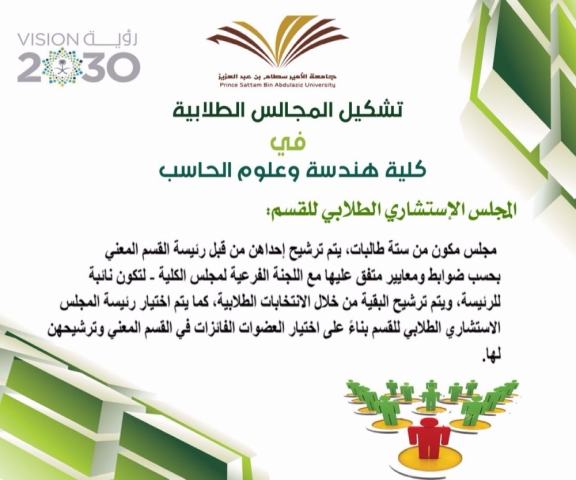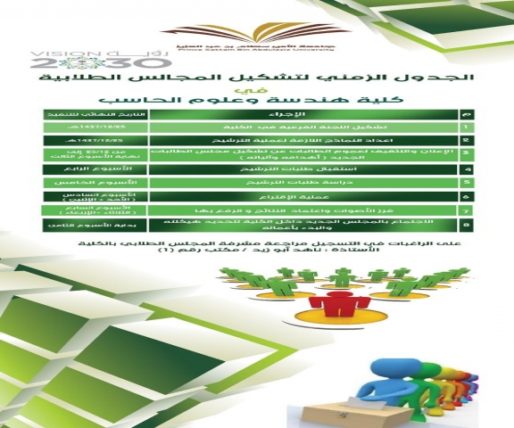 قام المجلس الطلابي بكلية هندسة وعلوم الحاسب بإعداد التصاميم والنشرات اللازمة والهامة لتشكيل المجلس الجديد في الكلية .كما قامت منسقة المجلس الطلابي الأستاذة / ناهد أبو زيد وعضو المجلس الطالبة / ابتهال القحطاني بحملة تثقيفية على جميع الطالبات في القاعات الدراسية ،حيث تم التعريف بالمجلس الطلابي الاستشاري ، وأهم أهدافه وأثره على الطالبة ،كذلك تم توضيح آلية الترشيح وتسليم الطلبات للعضوية . وبعدها تم تجهيز ركن من قبل رئيسة المجلس الطلابي الطالبة / بيسان المطوع يحتوي على نماذج الترشيح ودليل الترشيح للمجالس الطلابية وذلك بدءاً لإستقبال طلبات الترشيح لعضوية المجلس الجديد في الكلية بأذن الله .