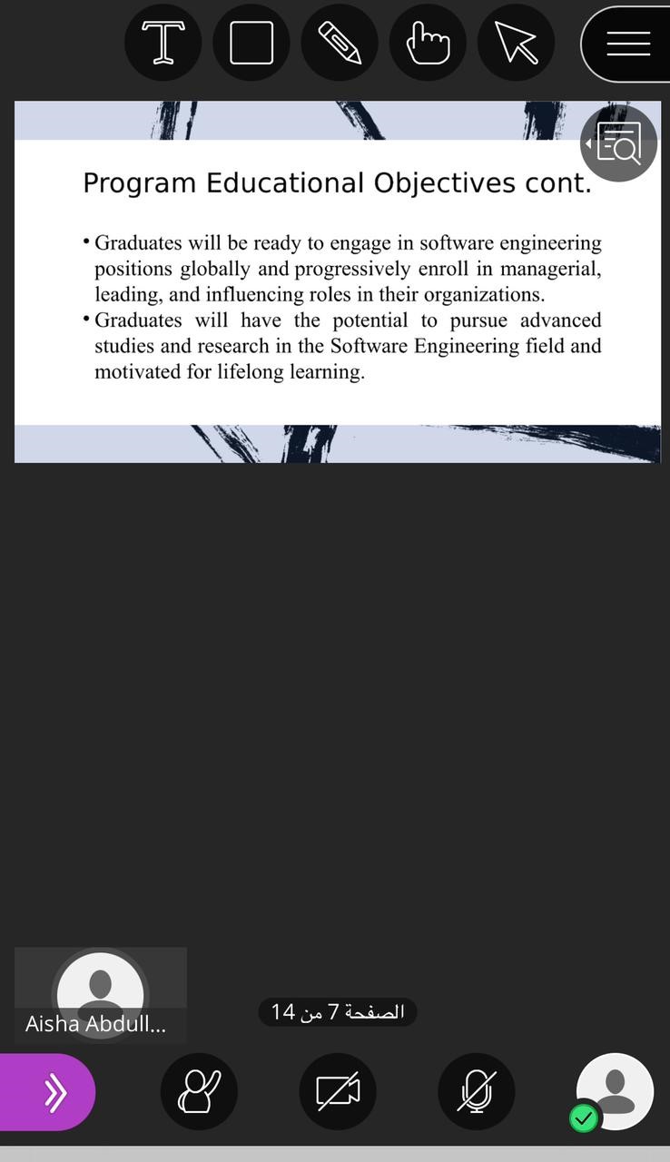 كما قامت مساعدة الوكيلة للشؤون التعليمية والأكاديمية د. عائشة عبدالله بالتوضيح والتعريف بقسم هندسة البرمجيات و أهدافه ..