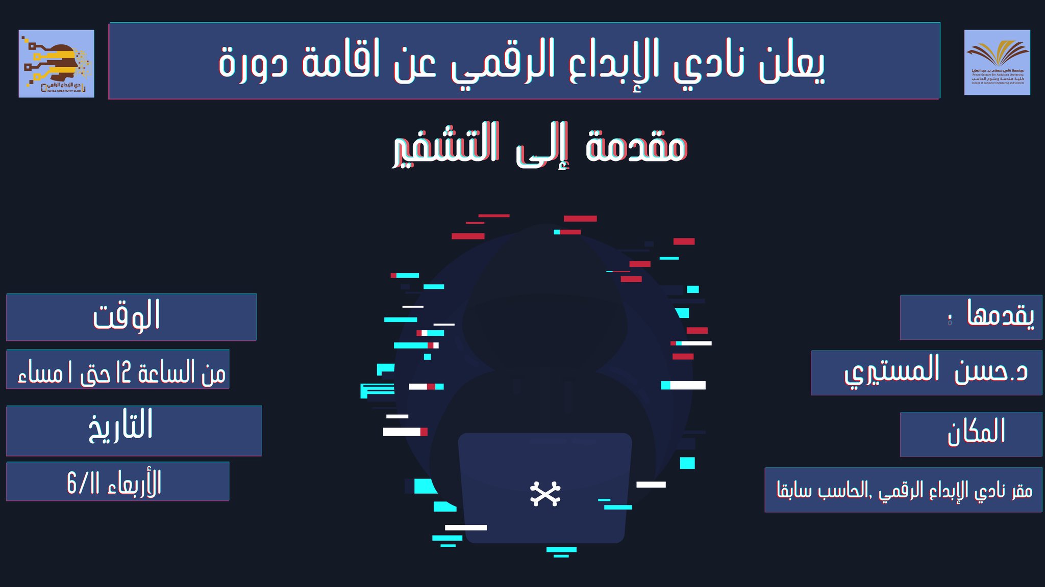 إعلان يعلن نادي الإبداع الرقمي بالكلية@psau_dccعن إقامة دورة بعنوان (مقدمة للتشفير) , وذلك يوم الأربعاء القادم الموافق 6 / 11 / 2019م من الساعة 12 وحتى الساعة 1 ظهراً