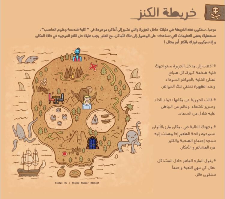 في صباح يوم الثلاثاء الموافق ١٤٤١/٦/١٧ المليء بالمغامرة والتشويق أطلق المجلس الطلابي بكلية هندسة وعلوم الحاسب-قسم الطالبات- بإشراف أ.نوف بالعبيد فعالية "خريطة الكنز" بحضور أكثر من ٥٠ طالبة والتي تهدف إلى تطوير فكر الطالبات ومراجعة مفاهيمهن بعدة أسئلة وأحجيات اشتملت على مفاهيم: البرمجة، التشفير، تراكيب البيانات وأسئلة عامة في الحاسب الآلي. حيث تم وضع خريطة للكلية مزودة بأحجيات لتبين أماكن وضع الأسئلة؛ بحيث تبحث الطالبات في كل مكان موضوع على الخريطة عن الأوراق المخفية المزودة بباركود السؤال ويقمن بحلها حتى يصلن إلى صندوق الكنز والذي يتم به جمع الإجابات ومراجعتها للسحب على الجوائز، ولاقت الفعالية استحسان جميع الطالبات حيث أشعلت حماسهن وروح التحدي بينهن.