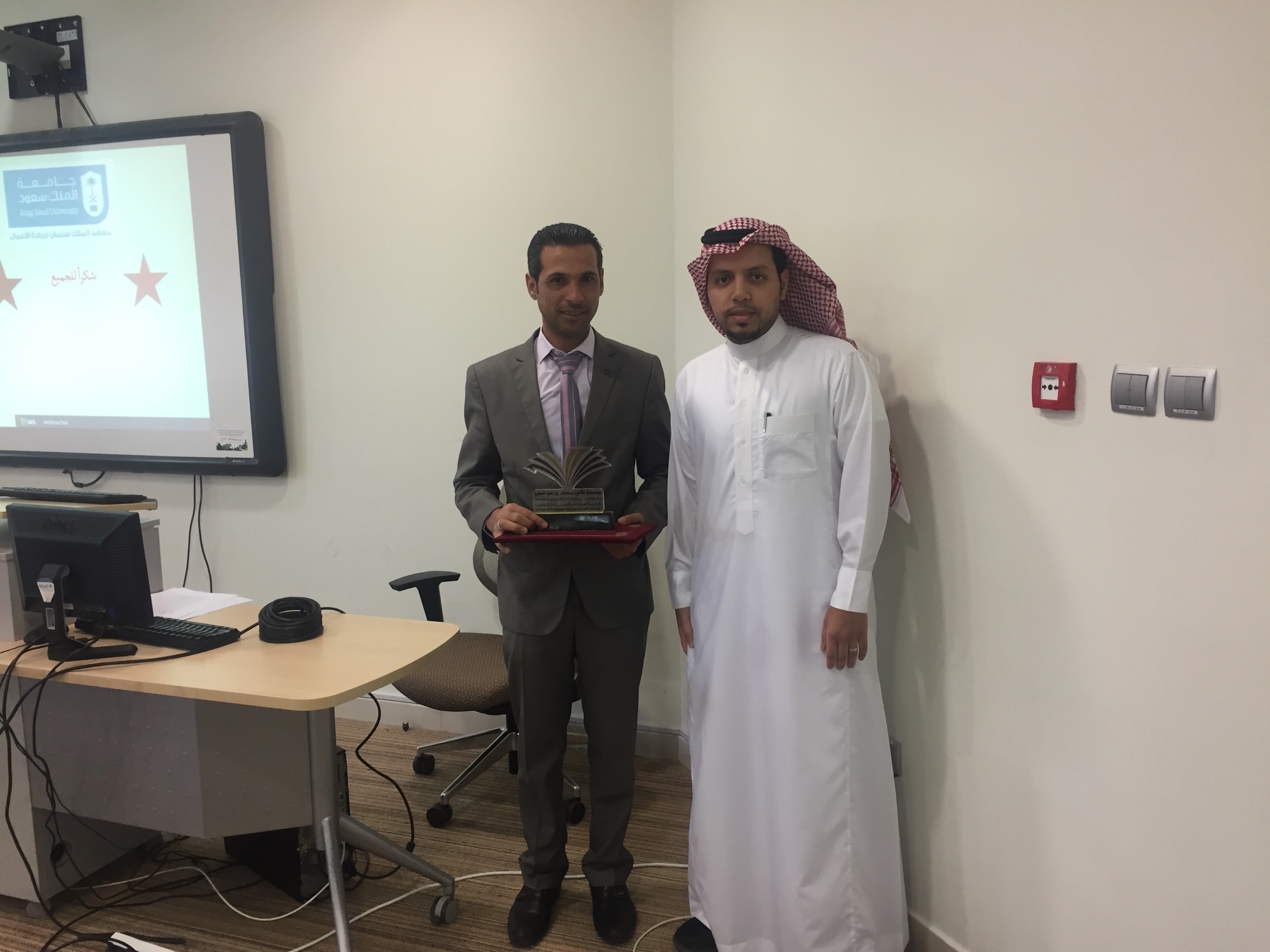 وفي ختام الدورة أعرب الأستاذ ناصر العنزي عن شكره وتقديره للأستاذ فادي على ما قدمه من محتوى في هذه الدورة وتم تقديم درعا تذكاريا بهذه المناسبة.