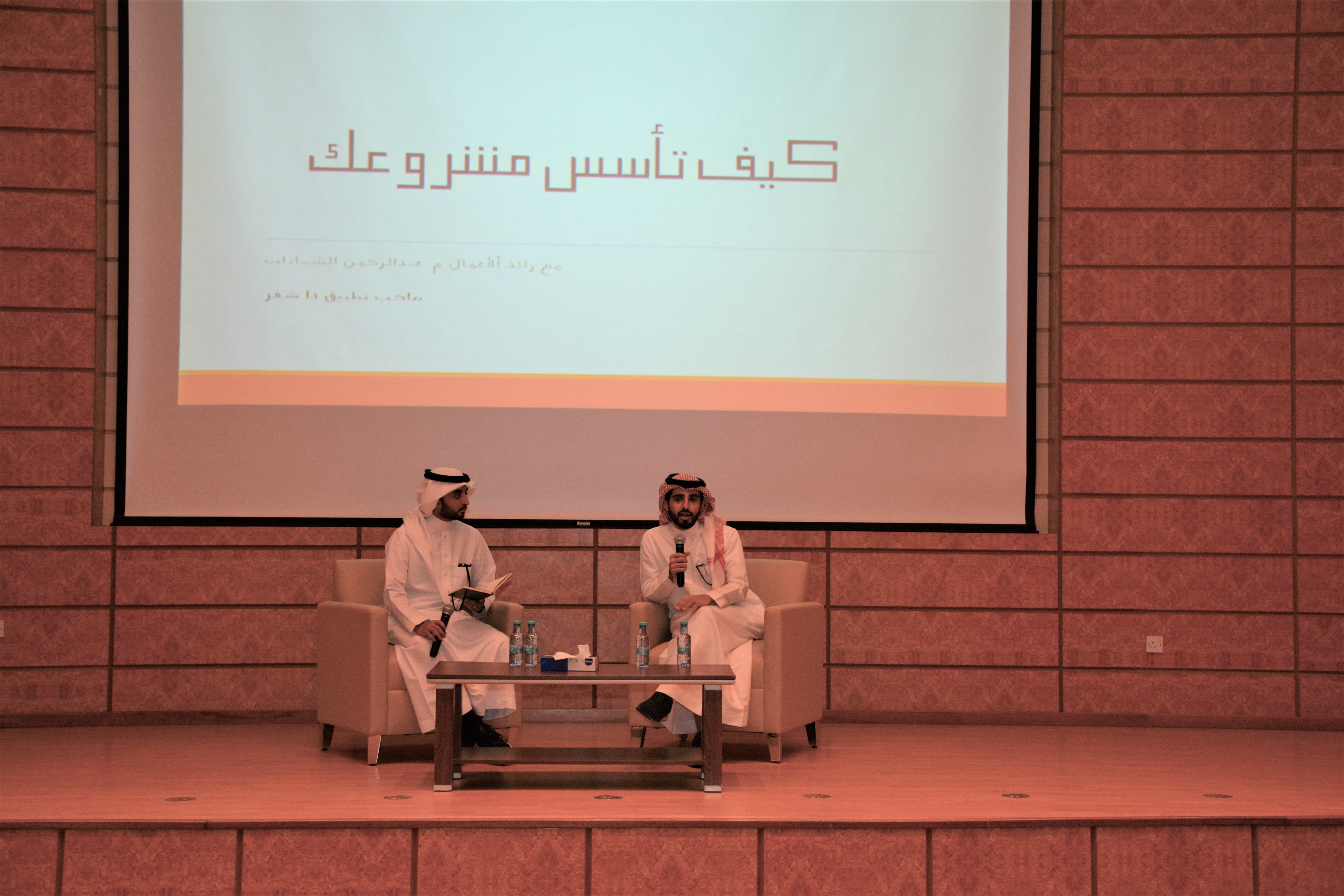 أقامت وحدة الأنشطة الطلابية في كلية هندسة وعلوم الحاسب يوم الثلاثاء 1440/02/28هـ الموافق لـ 2018/11/06م لقاء مفتوح مع المهندس/ عبد الرحمن الشبانات تحت عنوان "كيف تأسس مشروعك"وابتدأ اللقاء بترحيب من عضو وحدة الأنشطة الطلابية الأستاذ/ عبد العزيز بن محمد الحميضي بالحضور ومن ثم التعريف بالضيف الكريم المهندس/ عبد الرحمن الشبانات مؤسس تطبيق ذا شفز "THE CHEFZ".وتحدث الضيف عن كيفية الحصول على فكرة لتأسيس أي مشروع وتقييم مدى نجاح الفكرة والخطوات الأولى لتطبيقها على أرض الواقع.وتناول المهندس الشبانات في حديثه كل الجوانب المتعقلة بإقامة مشروع خاص وكيفية البحث عن شريك ومدى أهمية ذلك وكيفية تأسيس فريق عمل ومدى أهمية اختيار العناصر والجوانب المالية المتعلقة بأي مشروع.وفي ختام اللقاء اجاب الضيف على اسئلة الحاضرين وقدمت وحدة الأنشطة الطلابية في الكلية شكرها العميق للضيف الكريم على ما قدمه من فائدة كبيرة للحضور وتم تسليم المهندس/ عبد الرحمن الشبانات درع تذكاري بهذه المناسبة.