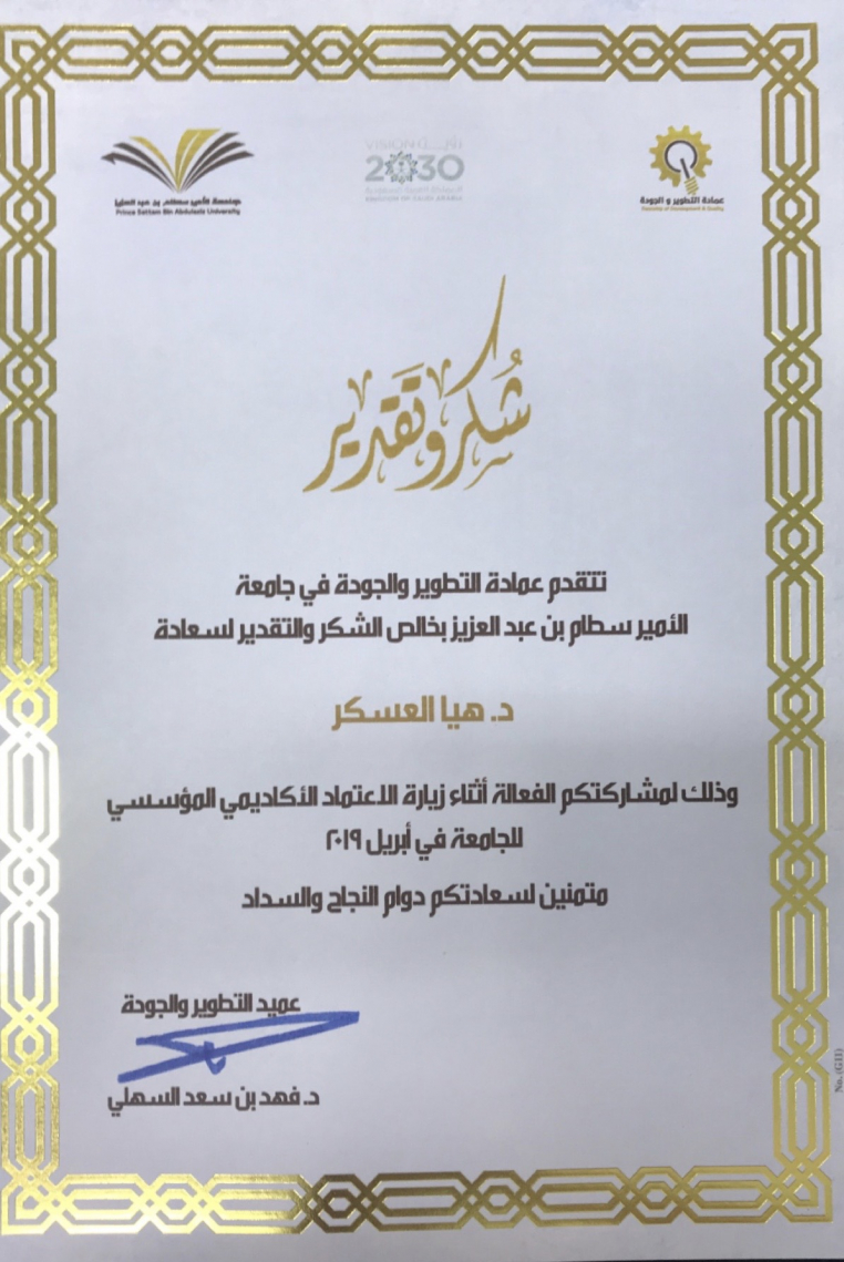 إعداد/عبدالعزيز بن عبدالله القرناس كلية هندسة وعلوم الحاسب بجامعة الأمير سطام بن عبدالعزيز بالخرج تعتبر أحد الصروح التعليمية المتقدمة الشاملة والتي تمضي دائماً في طريقها نحو التميز والريادة العالمية واضعة نصب عينيها من أجل الإرتقاء بالعملية التعليمية فيها موفرة البيئة الصحية المثالية المتكاملة لمنسوبيها من طلاب وطالبات وسعيها أيضاً نحو تميز أعضاء هيئة التدريس والموظفين فيها حيث أثمرت جهودها في الحصول على الاعتماد الأكاديمي الدولي من مجلس الاعتماد للهندسة والتكنولوجيا وذلك عام 2017م / 2018م حيث جاء ذلك الإعتماد الذي شمل جميع أقسام وبرامج الكلية بعد إتمامها جميع متطلبات الجودة كافة وتطبيق نظم ومعايير الاعتماد الأكاديمي بجميع أقسامها وتسعى الكلية نحو التميز في مجالات الحوسبة كافة من خلال إعداد خريجين مؤهلين ومنافسين على المستويين الوطني والإقليمي من خلال تقديم برامج أكاديمية متوافقة مع معايير الجودة وتشجيع إجراء البحوث العلمية وبناء الشراكات المجتمعية. المشرف على وحدة العلاقات العامة والإعلام بالكلية عبدالعزيز بن عبدالله القرناس أعد ونسق هذا الحوار مع سعادة وكيلة الكلية لشطر الطالبات الدكتورة هيا بنت محمد العسكر حيث بادرت سعادة وكيلة كلية هندسة وعلوم الحاسب بالإجابة على جميع الأسئلة المطروحة في الحوار بكل رحابة صدر وأريحية وجاءت على النحو التالي :- 1 – سعادة الوكيلة السلام عليكم ورحمة الله وبركاته وطابت أوقاتك بكل خير ومسرات ؟وعليكم السلام ورحمه الله وبركاته وحياكم الله . 2 – سعادة وكيلة الكلية الدكتورة هيا بنت محمد العسكر أعطينا نبذة البطاقة التعريفية عن سعادتكم ؟هيا بنت محمد العسكر-من مواليد مدينه الخرج حصلت على درجه الماجستير من جامعة اكستر من بريطانيا عام 2010م. وحصلت على الدكتوراه من جامعة ليفربول جان مووريس في بريطانيا عام 2014 م تخصص الذكاء الاصطناعي. اعمل حاليا وكيلة الكليه هندسه وعلوم الحاسب للسنه الثالثه. ، وشاركت في عدد من المؤتمرات المحلية والعالمية. ولدي العديد من الابحاث المنشوره في مجلات علمية وموتمرات. 3 – ما هي التجهيزات العلمية والعملية التي كانت قبل بدء العام الدراسي الجديد الجاري 1441هـ ؟بدايه نحمد الله على تيسيره وفضله الجميع في الكليه يعمل كفريق واحد مقسم لعده لجان مكمله لبعضها لبعض منها ماهو مختص في شوون الطالبات والارشاد الاكاديمي ومنها مايخص التجهيزات التعليمية والمستلزمات المكتبية وصيانة المعامل كذلك صيانة وتجهيز جميع مرافق الكلية وغير ذلك من اللجان الرئيسيه في الكليه نحن نقوم بعمل اجتماعات دورية لمتابعات سير الاعمال وتحقيق اهدافنا وتطلعات الجامعه حسب الخطة الاستراتيجية. 4 - ما هو الأمر الذي تعتبرينه أكثر أهمية وتتطلعين لتحقيقه خلال العام الدراسي الجديد الجاري 1441هـ ؟اظهار دور الكليه لخدمة الجامعه وتميزها على مستوى كليات الحاسب الالي في الجامعات المحلية بالحصول على التصنيفات المعتمدة وأبراز انشطه طالبات وذلك عن طريق مشاركاتهم في مؤتمرات والمحافل المتخصصة ونسعى لإعطاء دور للكلية في خدمة المجتمع وتقديم الدورات والاستشارات للمستفيدين. 5 – ما هي الخطة والرؤية المستقبلية التي تعتزم الكلية لشطر الطالبات القيام بها لتطوير مهارات وخبراتالطالبات ؟نسعى بإذن الله في الكلية لخدمة الطالبات وبناء قدراتهم الاكاديمية وصقل مهاراتهم لتسهيل حصولهم على وظيفه بعد التخرج باذن الله تعالى ايضا نسعى جاهدين في الكلية إلى ابراز دور أنشطة الطالبات ومشاريعهم وبحوثهم على مستوى المحلي والعالمي وذلك من خلال المشاركة بها في ملتقيات ومعارض والمؤتمرات العلمية. 6 – ماهي الأقسام الأكاديمية المتاحة حالياً بالكلية لشطر الطالبات ؟.حالياً قسمين وهم علوم الحاسب ونظم المعلومات وباذن الله قريبا قسم هندسة البرمجيات 7 – كيف تتعامل سعادتكم مع المشاكل المقدمة من طالبات الكلية وماهي إجراءاتك المتخذة لعلاجها ؟نستقبل جميع الطالبات ونحتويهم وعندما تر