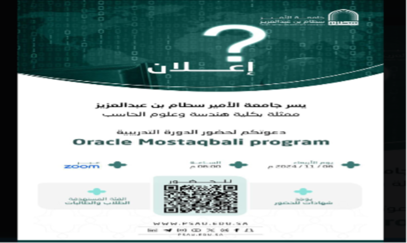 هدفت الورشة التدريبية التي قدمتها د. علا القحطاني إلى تعريف الطلاب والطالبات ببرنامج Oracle Mostaqbali وهو برنامج تقني طورته جامعة أوراكل بالشراكة مع Future Work ووزارة الموارد البشرية والتنمية الإجتماعية في المملكة العربية السعودية، يهدف هذا البرنامج الى تمكين السعوديين من المهارات الرقمية والتقنية مع التركيز على دعم النساء والشباب و سد الفجوة في المهارات الرقمية المطلوبة لسوق العمل و تعزيز الاستعداد الوظيفي للوظائف التقنية المستقبلية وتوفير معرفة تقنية متقدمة في مجالات التكنولوجيا، التطبيقات السحابية، والهندسة الرقمية ودعم رؤية البرنامج في تمكين 50 ألف سعودي من المهارات الرقمية بحلول عام 2027 .