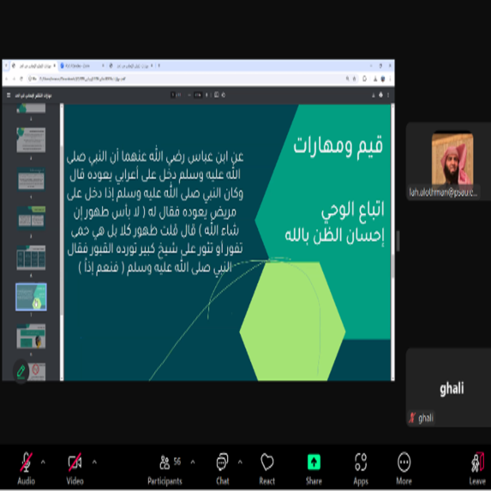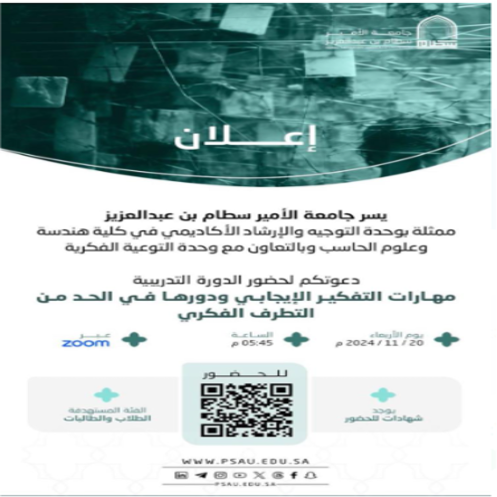 في إطار جهودها لتعزيز الوعي الفكري وترسيخ القيم الإيجابية نظّمت وحدة التوجيه والإرشاد الأكاديمي بالتعاون مع وحدة التوعية الفكرية برنامجًا بعنوان: "مهارات التفكير الإيجابي ودورها في الحد من التطرف الفكري"، وذلك يوم الأربعاء الموافق 20 نوفمبر 2024م.