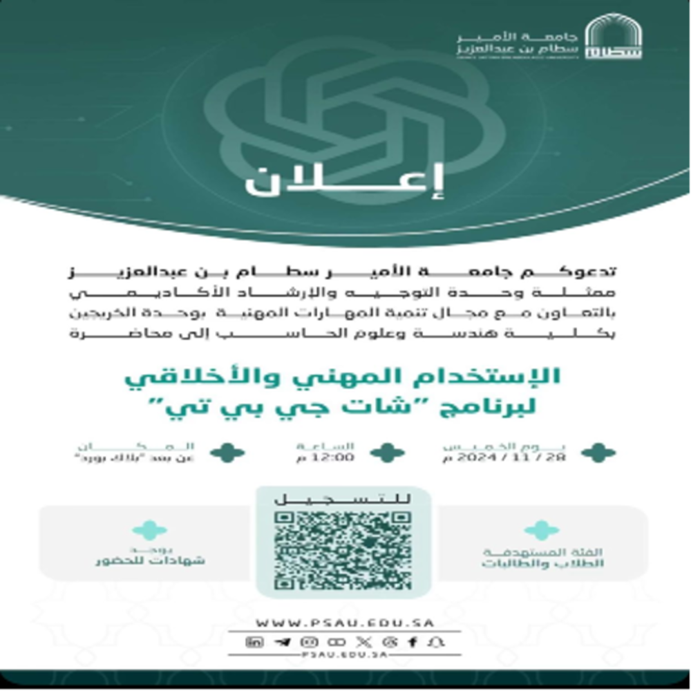 في إطار تعزيز مهارات الطلاب في التعامل مع تقنيات الذكاء الاصطناعي و تحت إشراف وكالة الشؤون الأكاديمية بكلية هندسة وعلوم الحاسب نظمت وحدة التوجيه والإرشاد الأكاديمي بالتعاون مع مجال تنمية المهارات المهنية بوحدة الخريجين في كلية هندسة وعلوم الحاسب ورشة تدريبية بعنوان "الاستخدام المهني والأخلاقي لـ ChatGPT".