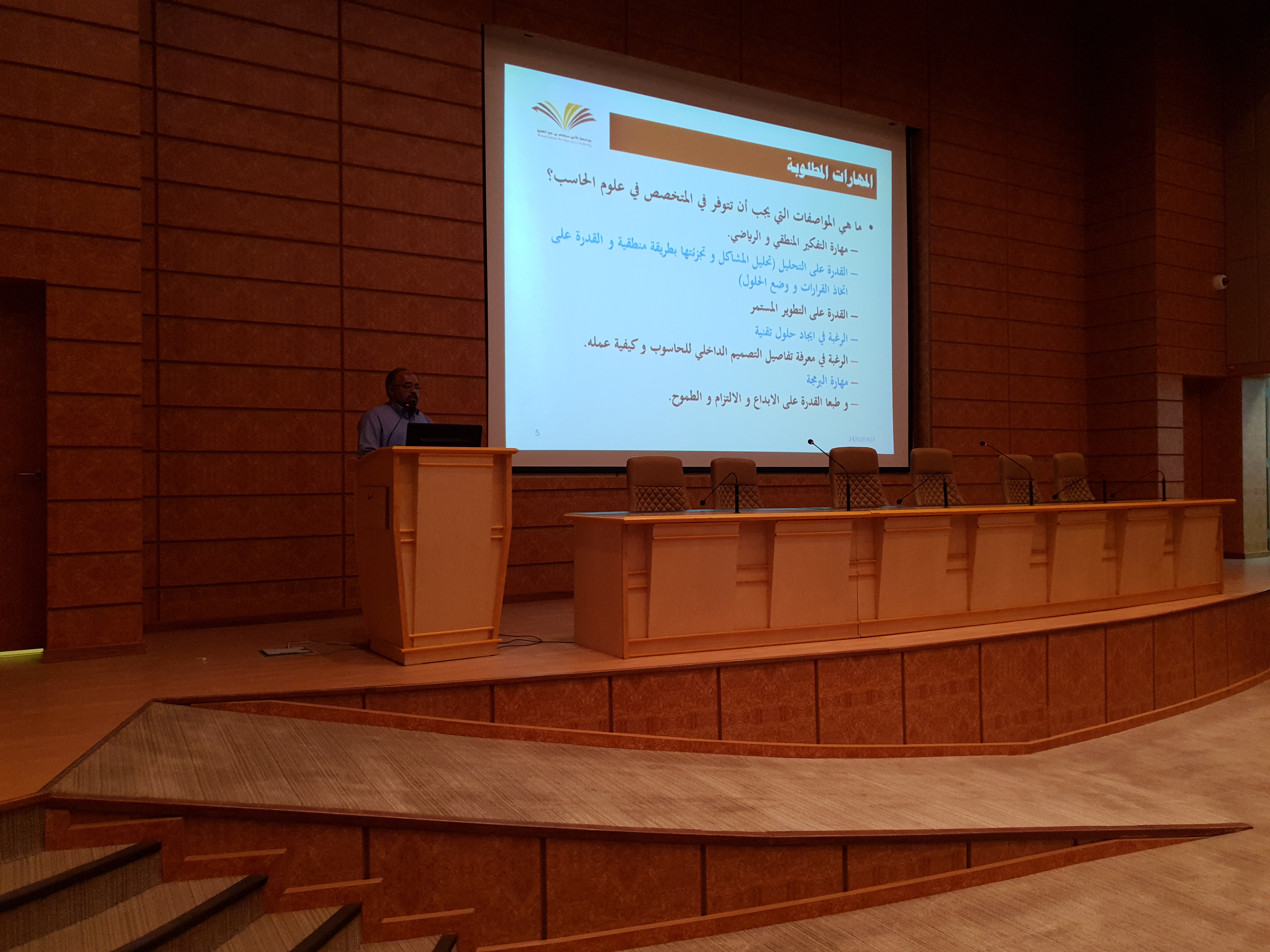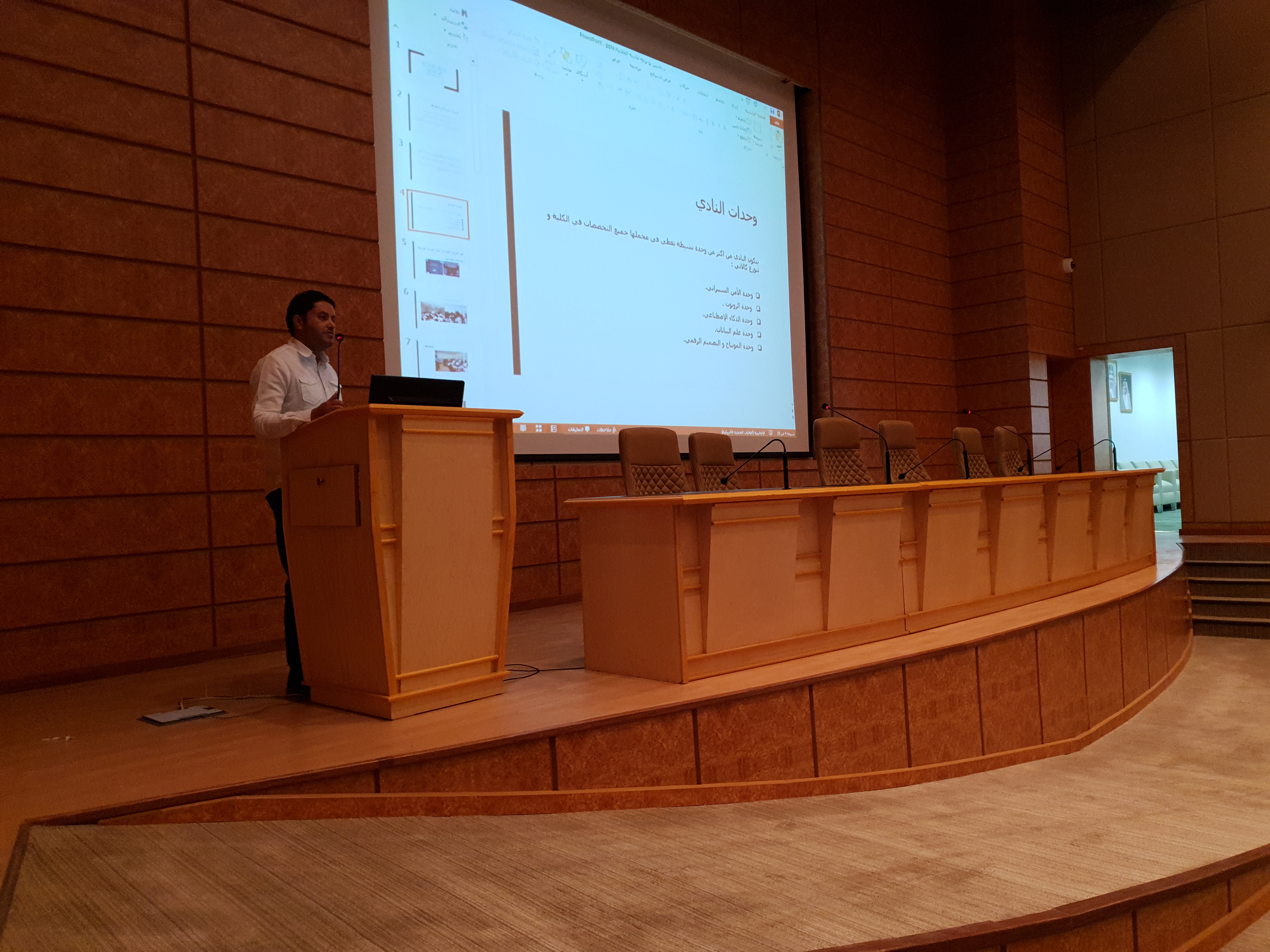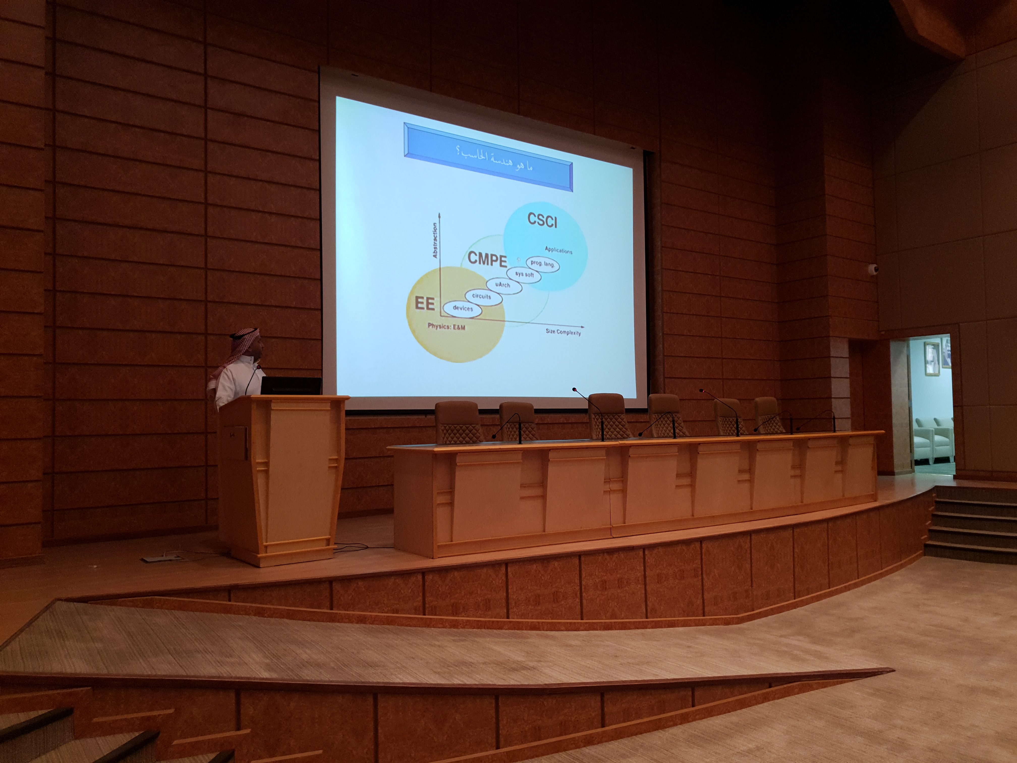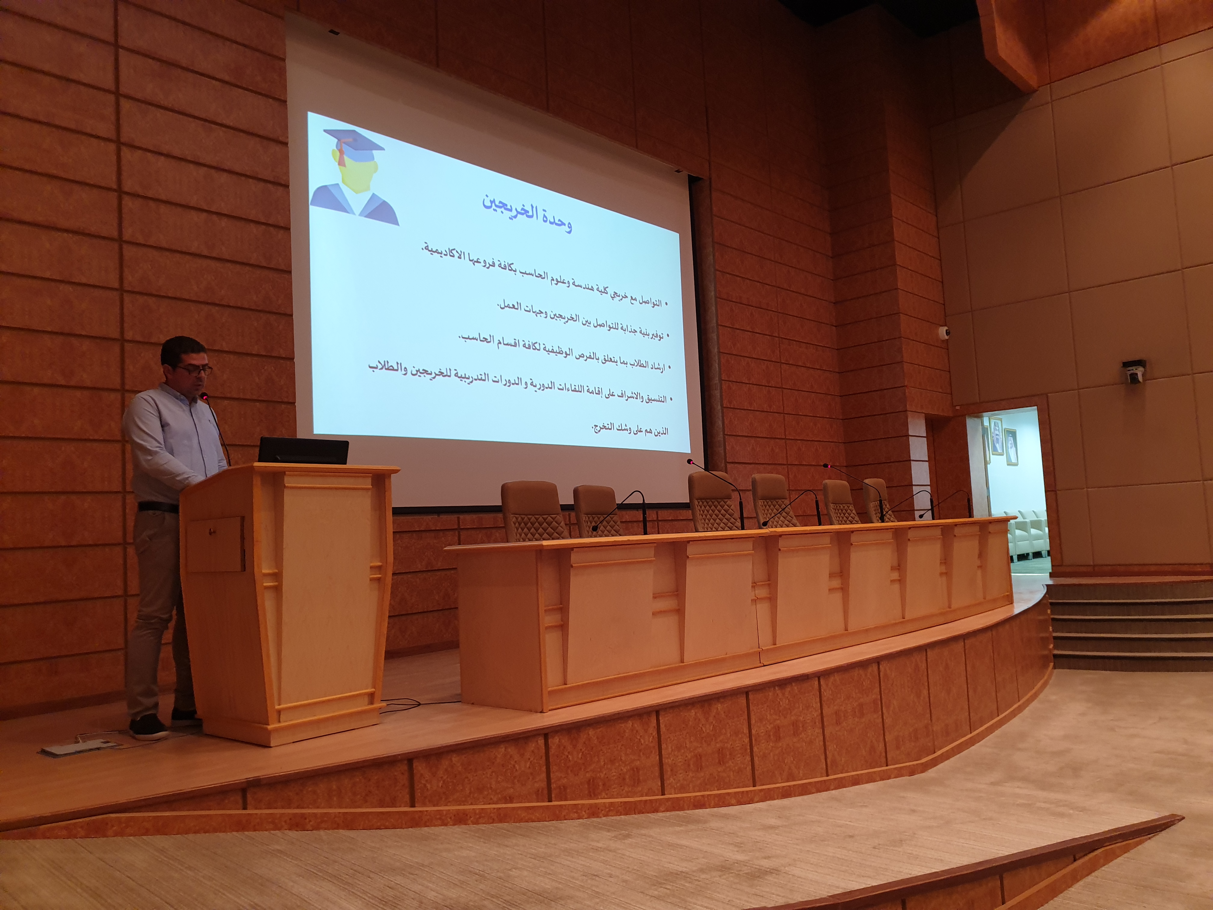 تحت رعاية وحضور عميد الكلية الدكتور محمد بن بطاح الشمري أقامت كلية هندسة وعلوم الحاسب بجامعة الأمير سطام بن عبدالعزيز بالخرج اليوم الثلاثاء الموافق 18 / 1 / 1441هـ اللقاء التعريفي للطلاب المستجدين للعام الدراسي الجامعي الجديد 1441هـ وذلك في تمام الساعة الحادية عشر صباحاً بالمسرح الرئيسي بمبنى إدارة الكلية. وخلال بداية اللقاء رحب سعادة عميد الكلية بالطلاب المستجدين ثم استعرض لهم رؤية ورسالة أهداف الكلية وحثهم على التحصيل العلمي والاجتهاد والمثابرة في طلب العلم والالتزام والتقيد بحضور المحاضرات وتزويدهم بالمعلومات الإرشادية المهمّة التي يستطيعون من خلالها التعرّف على ما يُقدّم لهم من خدمات متمنياً لهم التوفيق والنجاح وتحقيق أمنياتهم , عقب ذلك تحدث مساعد الوكيل للشؤون التعليمية والأكاديمية الدكتور مهدي خماخم عن اللجان والوحدات التي تعنى بشؤون الطالب بما فيها اللوائح والأنظمة وحقوق وواجبات الطالب المتعلقة بمسيرته الأكاديمية في الجامعة والتي من شأنها تخدم الطالب , عقب ذلك تحدث الدكتور أحمد عبدالرحمن للطلاب عن دور المرشد الأكاديمي وخصائصة وكيفية إستفادة الطالب منه في سبيل التوجيهات الدراسية , عقب ذلك تحدث الدكتور ياسين بوترعه عن الأندية الطلابية والأنشطة الداخلية في الكلية وطريقة الإلتحاق فيها والإستفادة منها في تنمية معارف الطالب ومن ما تقدمه لهم من فتح أفاق صحتهم البدنية إضافة إلى صقل موهبتهم وهي مثال ناجح لزيادة الألفة والتقارب مابين طلاب ومنتسبين الكلية ومساهمتها إيجابياً وفكرياً ومعنوياً لهم وتنعكس على مستوى دراستهم وإنتمائهم في الكلية , ثم جرى خلال اللقاء إستعراض رؤساء الأقاسم بالكلية الدكتور سليمان النذير "قسم هندسة الحاسب" والدكتور محمد حجازي "قسم علوم الحاسب" والدكتور أبو بكر الصديق "قسم نظم المعلومات" شرحاً مفصلاً عن الأقسام إشتملت على تخصصاتها وخطتها الدراسية وماهي طبيعة عمل الخريجين منها في سوق العمل كما تم فتح باب الأسئلة والإستفسارات لدى الطلاب الحاضرين والرد عليها وتضمن اللقاء في نهايته قيام إدارة العلاقات العامة والإعلام بالكلية ممثلة بالموظف عبدالعزيز بن عبدالله القرناس بإصطحاب الطلاب إلى جولة تعريفية في أروقة الكلية من أجل التعرف على مكاتب أعضاء هيئة التدريس والقاعات الدراسية والمعامل الطلابية والمكتبة العامة وموقع خدمات الطالب. يذكر أن هذا اللقاء يقام بشكل سنوي حرصاً من كلية هندسة وعلوم الحاسب ومسؤوليها على تهيئة الطلاب المستجدين وتعريفهم بحقوقهم وواجباتهم خلال سنوات الدراسة بالكلية مما يسهم في رفع مستوي الوعي لديهم ويكون له بالغ الأثر في تفوقهم ونجاحهم.