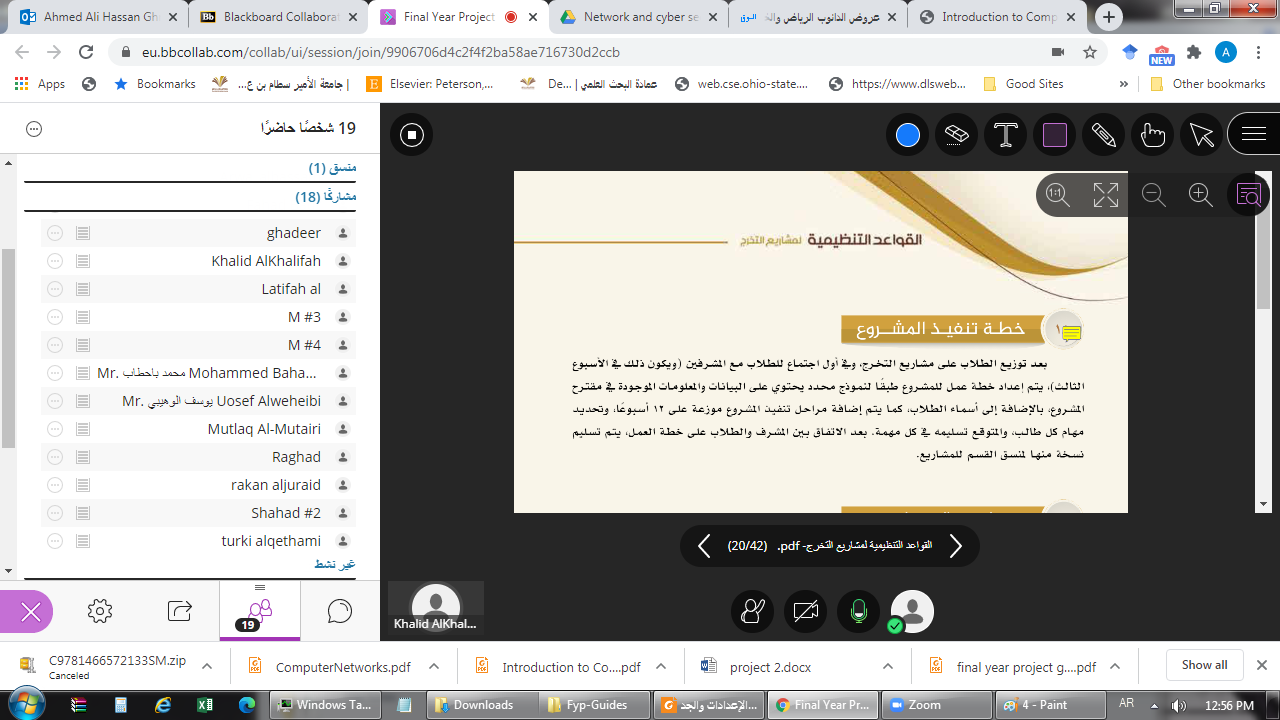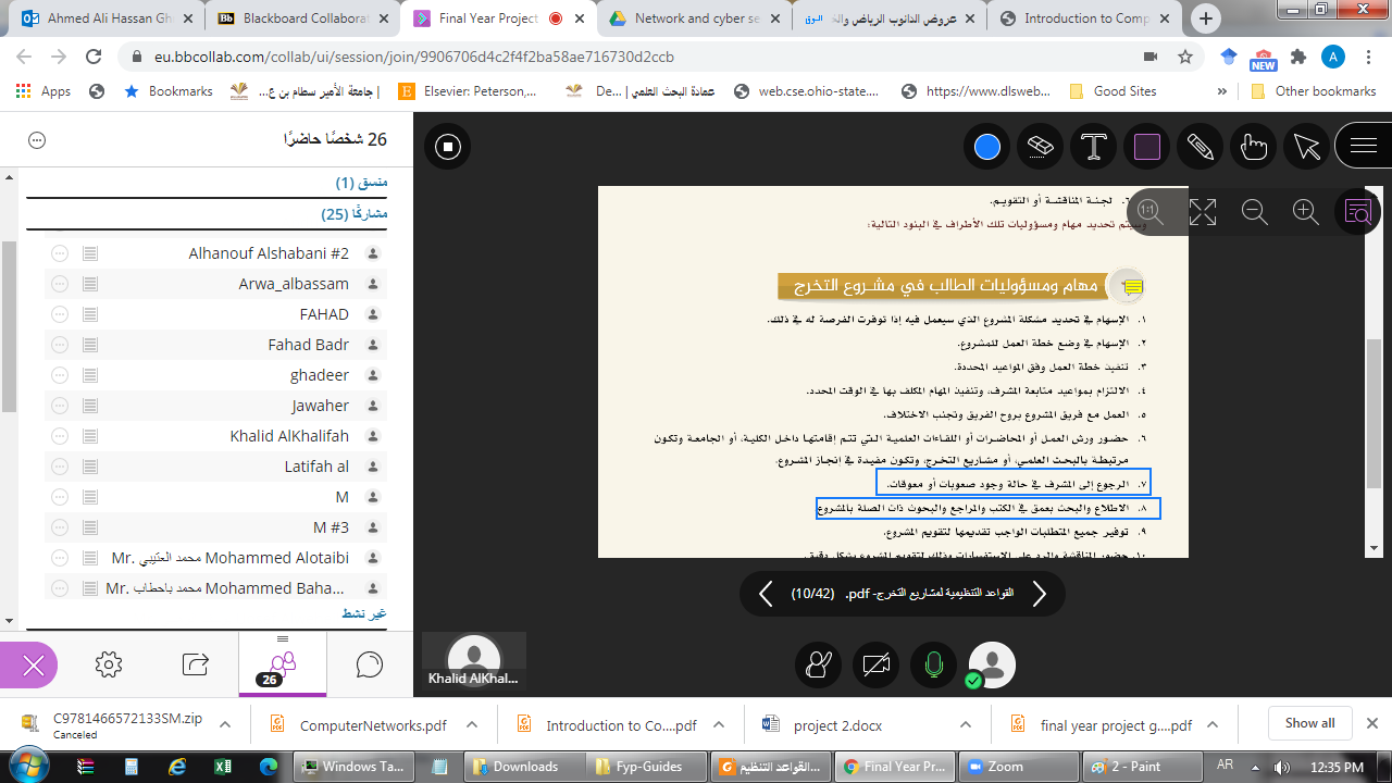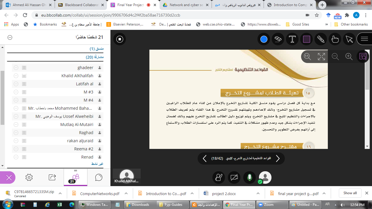 في ظل الجهود الحثيثة لتأهيل وصقل الطلاب والطالبات وتطوير مهاراتهم وتمكينهم من التعرف والتهيؤ لعمل مشروع التخرج الذي يسهم في رفع جودة الحياة الوظيفية التقنية للطلبة ويدفعهم للتفكير بالتطوير الذي تنشده رؤية المملكة العربية السعودية 2030 بما يرتقي بهم ليكونوا صناع الغد وبناة المستقبل الأفضل , فقد نظمت لجنة المشاريع الطلابية بكلية هندسة وعلوم الحاسب بجامعة الأمير سطام بن عبدالعزيز لطلابها وطالباتها اللقاء الأول مع طلبة مشاريع التخرج 1 وذلك يوم أمس الأربعاء الموافق 28 / 1 / 1442هـ في تمام الساعة 12:00 ظهراً عبر القاعة الإفتراضية الإلكترونية عن بُعد , ألقاها رئيس لجنة المشاريع الطلابية بالكلية وعضو هيئة التدريس في قسم علوم الحاسب الدكتور أحمد علي غنيمات .