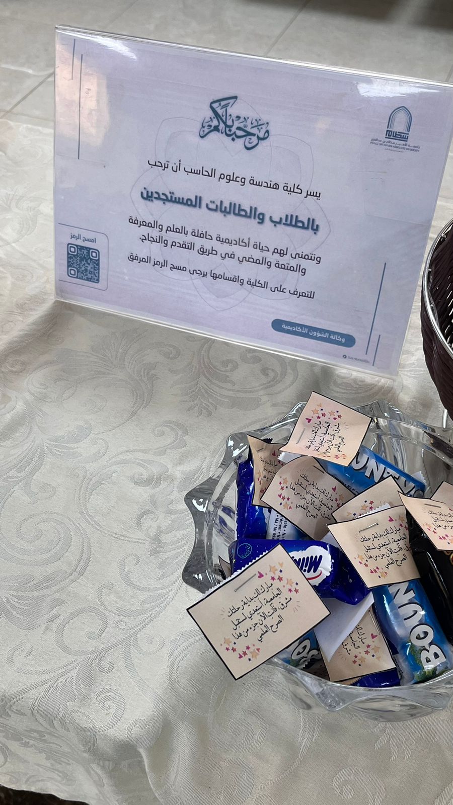 أقامت كلية هندسة وعلوم الحاسب بشطر الطالبات لقاءً ترحيبيًا للطالبات المستجدات تحت إشراف الدكتورة فاطمة الريان، رئيسة وحدة الإرشاد والتوجيه، وبالتعاون مع وحدة العمل الطلابي. هدف الحفل إلى تعريف الطالبات بالجامعة ومرافقها، بالإضافة إلى تقديم الدعم والإرشاد اللازمين لبدء رحلتهن الأكاديمية بنجاح. كما تم خلال الحفل استقبال تساؤلات الطالبات والإجابة عليها، مما ساهم في تهيئة بيئة داعمة تساعدهن على التكيف مع الحياة الجامعية.