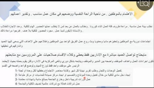 وحث سعادة العميد منسوبي ومنسوبات الكلية من أعضاء هيئة التدريس والموظفين والموظفات على أهمية الإتقان في أداء المسؤوليات والأعمال الأكاديمية والوظيفية الخاصة بهم تحت هذه الظروف الاستثنائية التي تتزامن مع جائحة كورونا والاهتمام بالعمل وإعطاء عناية قصوى للطلاب والطالبات من الخدمات التي تقدمها الكلية سواء خدمات حضورية أو عن بعد واكتساب المزيد من المهارات في ظل التكنولوجيا الحديثة موجهاً سعادته العديد من النصائح والإرشادات التي تعينهم على أداء أعمالهم بأفضل صورة ممكنة.