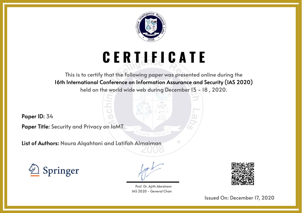 قدم سعادة عميد كلية هندسة وعلوم الحاسب بجامعة الأمير سطام بن عبدالعزيز بالخرج الدكتور عادل بن باجد بن بصيص ووكيل الكلية للدراسات العليا والبحث العلمي والجودة الدكتور أحمد بن عمر عسيري بالغ التبريكات والتهاني لطالبتان الكلية في مرحلة الماجستير وهن الطالبة نورة القحطاني والطالبة لطيفة الميمان وذلك بمناسبة قبول ورقتهم العلمية في مؤتمر (16th International Conference information assurance and Security) والمنعقد خلال الفترة من 15 وحتى 18 ديسمبر الجاري 2020م والمصنف في شبكة سكوبس لمجال الأبحاث المنشورة في الدوريات العالمية بين الباحثين.