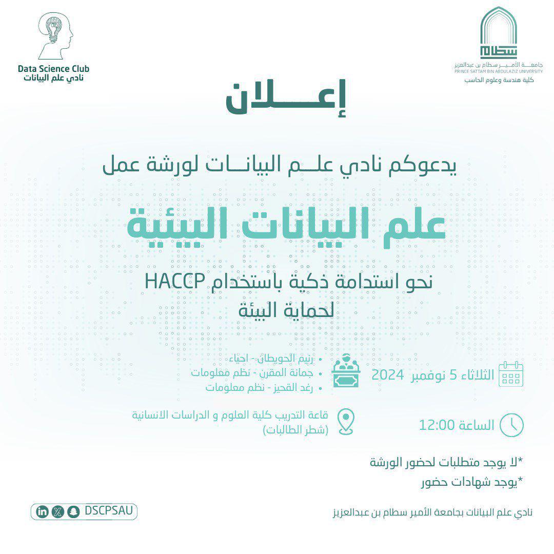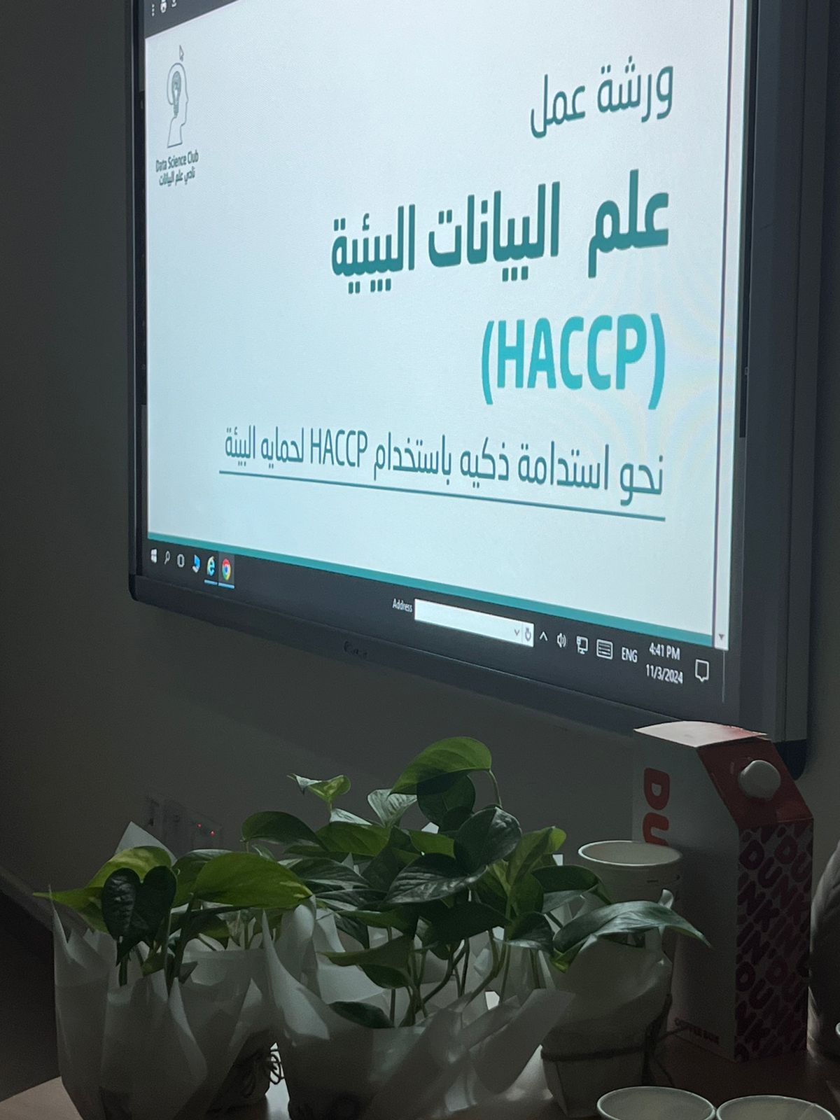 في إطار سلسلة الورش المتخصصة التي ينظمها نادي علم البيانات أقيمت ورشة عمل بعنوان " علم البيانات البيئية نحو استدامة ذكية لحماية البيئة باستخدام نظام HACCP " وذلك في كلية العلوم والدراسات الإنسانية بقسم الأحياء بجامعة الأمير سطام بن عبدالعزيز .