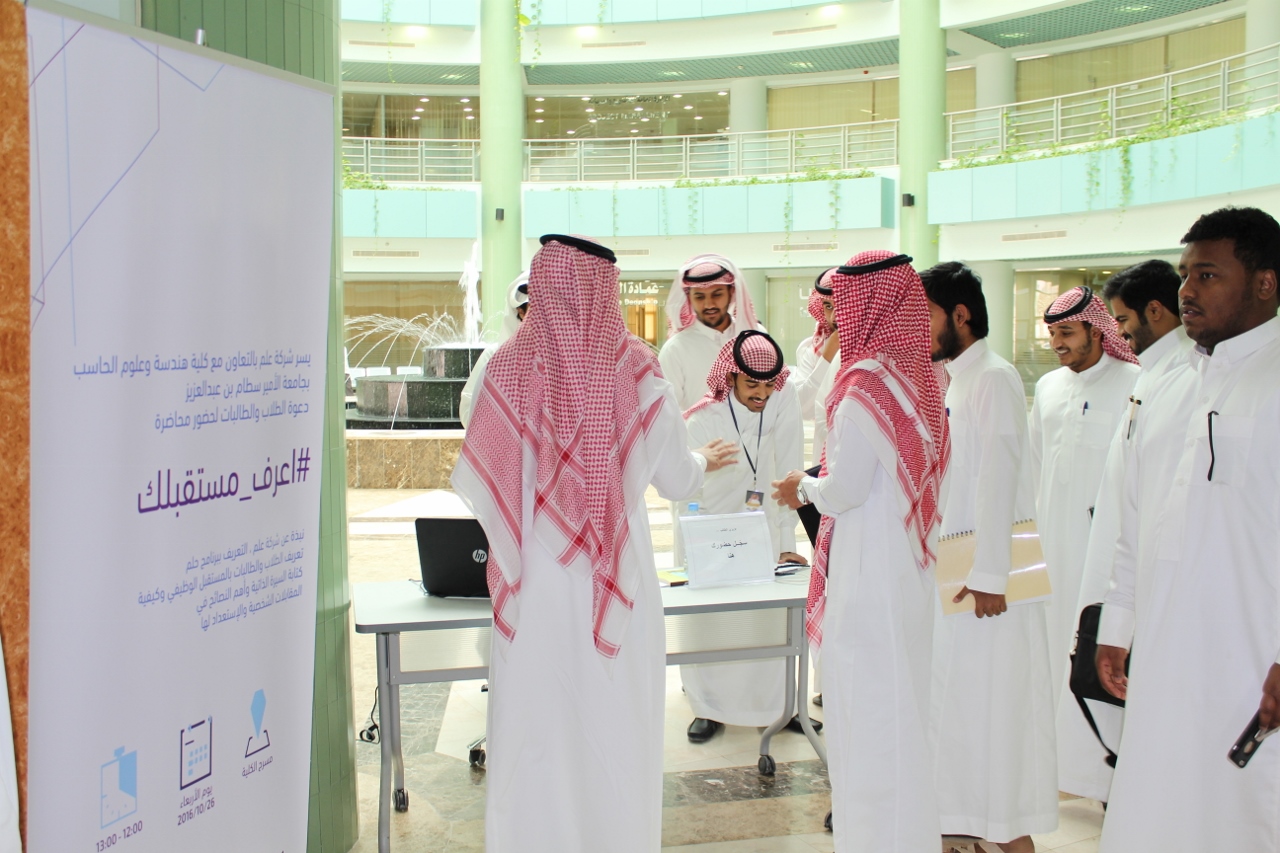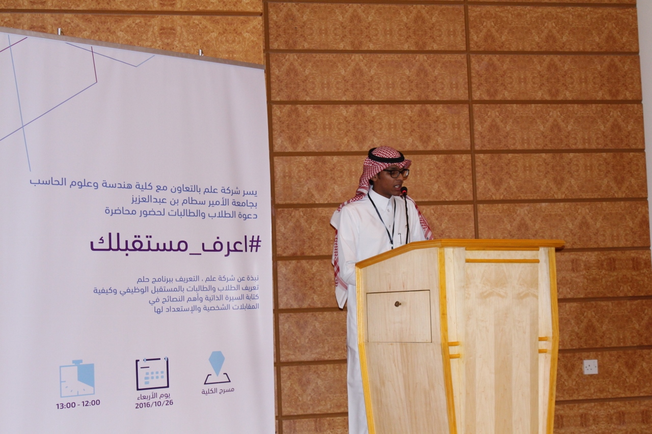 إيمانا من كلية هندسة وعلوم الحاسب بأهمية مد جسور التواصل بين المجال الأكاديمي والمجالات العملية، فقد قامت الكلية باستضافة شركة علم الشركة الوطنية الرائدة في مجال تطوير الخدمات الإلكترونية الحكومية والخاصة. والتي تقوم بدورها عبر برنامجها حلم بدعم طلاب وطالبات الجامعات السعودية في مجال الحاسب الآلي والتقنية. قامت شركة علم يوم الأربعاء 25 محرم 1438هـ بالتعاون مع كلية هندسة وعلوم الحاسب بتقديم محاضرة لطلاب وطالبات الكلية بعنوان #اعرف_مستقبلك. بدأ اللقاء بمقدمة من مدير برنامج حلم ووحدة الإبداع بشركة علم المهندس أسامة جان عن شركة علم ومجالاتها التقنية المختلفة وأهم مشاريعها الحكومية مثل تطبيق "أبشر". كما أوضح المهندس أسامة أهمية إلمام الطالب الجامعي بطبيعة سوق العمل الذي يبحث عن الكفاءة والخبرة، ومن هذا المنطلق جاءت سياسة التوعية والتثقيف للمجتمع الطلابي من قبل شركة علم. وانتقل الحوار بعد ذلك إلى مسؤول برنامج حلم المهندس زياد الغامدي والذي قام بعرض معلومات تحفيزية رائعة للطلاب والطالبات عن برنامج حلم وما يقدمه للطالب الجامعي من تعليم ودورات وتطوير الأفكار وتوفير الأدوات ودعم مشاريع التخرج. بعد ذلك تفاعل الطلاب مع حديث مسؤول التوظيف بشركة علم الأستاذ عبدالرحمن الخريجي بعرضه لأهم النقاط المتبعة لكتابة السيرة الذاتية الناجحة. وأهم وسائل التفوق في المقابلة الوظيفية. وحضر اللقاء كلا من سعادة وكيل الكلية د/عبدالعزيز بن عبدالله الداعج وسعادة وكيل الكلية للتطوير والجودة د/عبدالإله بن عبدالعزيز الوابل وعدد من أعضاء هيئة التدريس وشهدت المحاضرة حضور كبير جداً من طلاب الكلية اكتظ مسرح الكلية بهم. واختتم اللقاء بالإجابة على تساؤلات الطلاب والطالبات والسحب على عدة جوائز قيمة مقدمة من شركة علم لطلاب وطالبات الكلية.