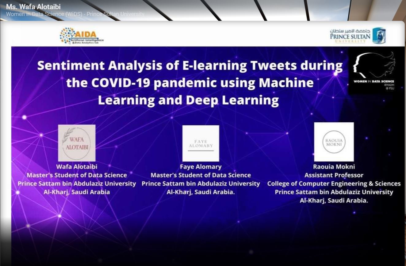 قدم سعادة عميد كلية هندسة وعلوم الحاسب بجامعة الأمير سطام بن عبدالعزيز بالخرج الدكتور عادل بن باجد بن بصيص ووكيل الكلية للدراسات العليا والبحث العلمي والجودة الدكتور أحمد بن عمر عسيري بالغ التبريكات والتهاني لطالبتان الكلية في مرحلة الماجستير لعلم البيانات وهن الطالبة وفاء العتيبي والطالبة في العمري وذلك بمناسبة حصولهم على المركز الأول في المسابقة المتاحة في مؤتمر"المرأة في علم البيانات" بنسخته الرابعة (WiDS poster competition 2021) التي نظمته جامعة الامير سلطان بالتعاون مع جامعة ستانفورد الأمريكية وبمشاركة متحدثات وعالمات في علم البيانات من دول عربية وأجنبية ينتمين إلى أوساط أكاديمية ومؤسسات وشركات عالمية وذلك تحت إشراف عضوة هيئة التدريس بالكلية الدكتورة راوية المكني تمثلت المشاركة تحت عنوان Sentiment Analysis of E-learning Tweets during the COVID-19 pandemic using Machine Learning and Deep Learning