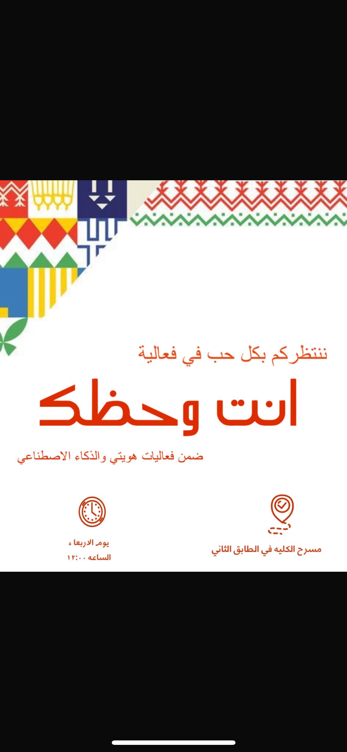 شهدت الفعالية حضورًا كبيرًا من الطالبات، وهدفت إلى استخدام تقنيات الذكاء الاصطناعي في التعريف باليوم الوطني وإبراز التراث والهوية الوطنية بأسلوب مبتكر.