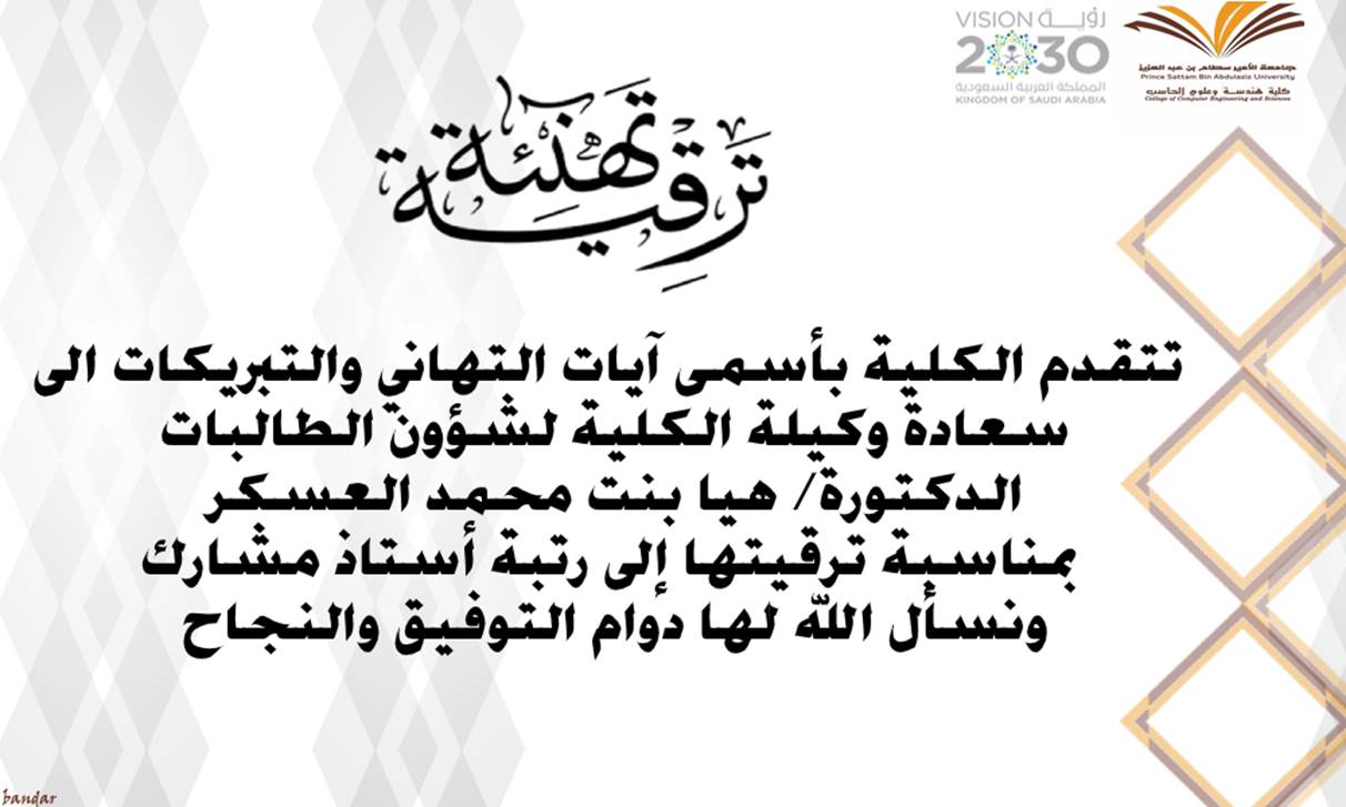 نيابةً عن منسوبي ومنسوبات الكلية يتقدم عميد الكلية د.محمد بن بطاح الشمري بأطيب التهاني والتبريكات للدكتوره هيا العسكر بمناسبة صدور قرار المجلس العلمي بترقيتها إلى رتبة أستاذ مشارك متمنين لها دوام التوفيق والسداد