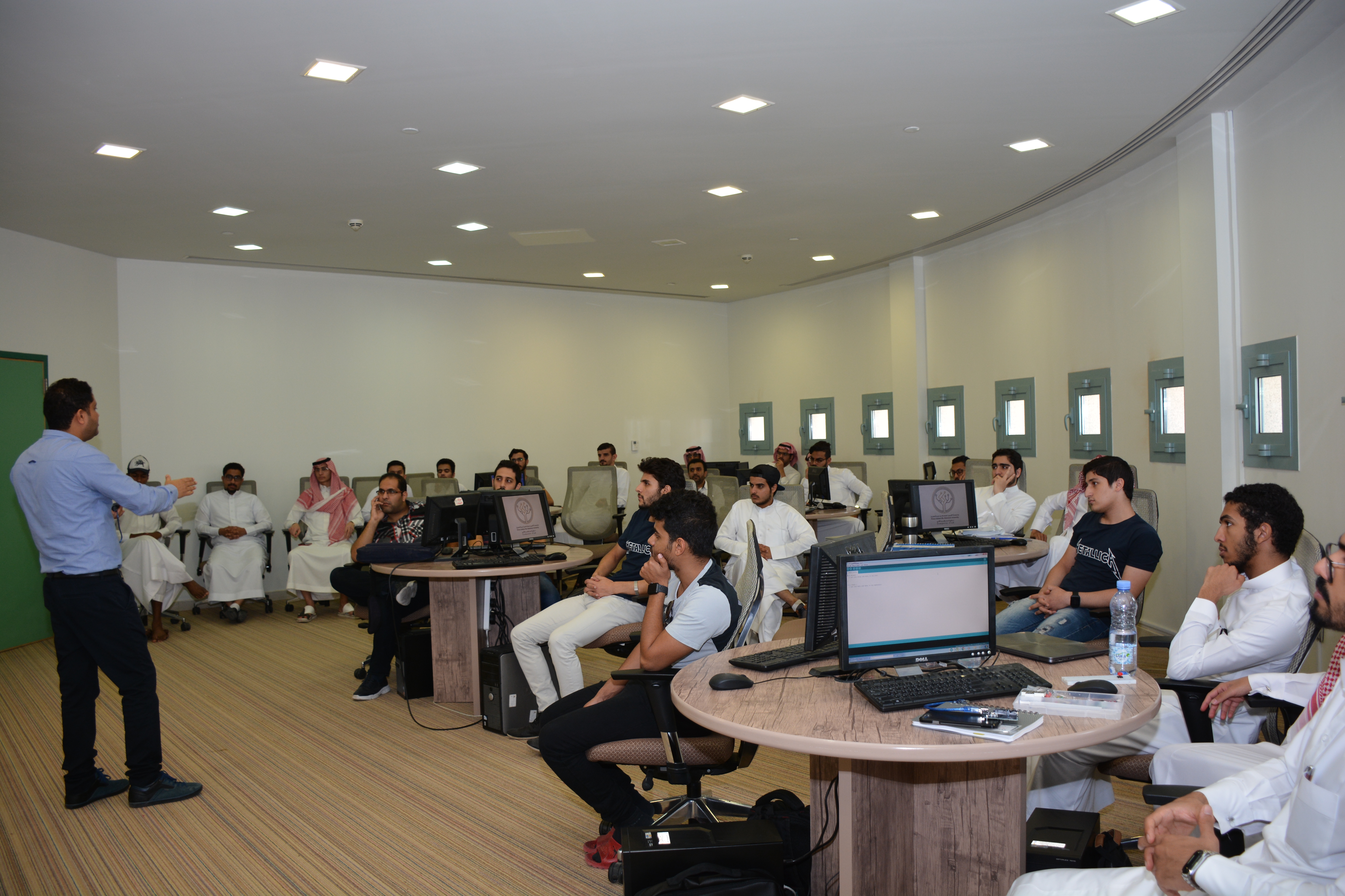 أقامت وحدة الروبوت بنادي الإبداع الرقمي في الكلية يوم الثلاثاء 1440/02/14هـ الموافق لـ 2018/10/23م ورشة عمل بعنوان "Arduino Workshop" القاها الدكتور ياسين صالح بوترعة.وابتدأت الورشة بالحديث عن نظام الأردوينو كنظام مفتوح المصدر ومتحكم منطقي قابل للبرمجة، بحيث يستطيع المستخدم أن يبرمج اللوحة من أجل تنفيذ وظيفة أو مهمة ما.وتناولت الورشة النظام من حيث الهندسة والبرمجة والتطبيقات وأن النظام مثل جهاز كمبيوتر صغير يمكن برمجته، للحصول على البيانات وكذلك التحكم بتطبيقات الكمبيوتر والجوال.كما أن بيئة البرمجة الخاصة بها مجانية ومفتوحة المصدر، ويمكن تحسينها وإضافة توسيعات لها من قبل المبرمجين أيضاً حول العالموقد كان الحضور مميزاً من طلاب الكلية وخارجها وأختتمت أعمال الورشة بتطبيق عملي على لوحات الأردوينو قام بها الطلاب.