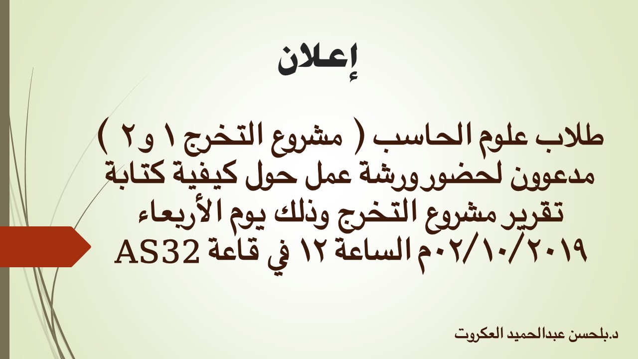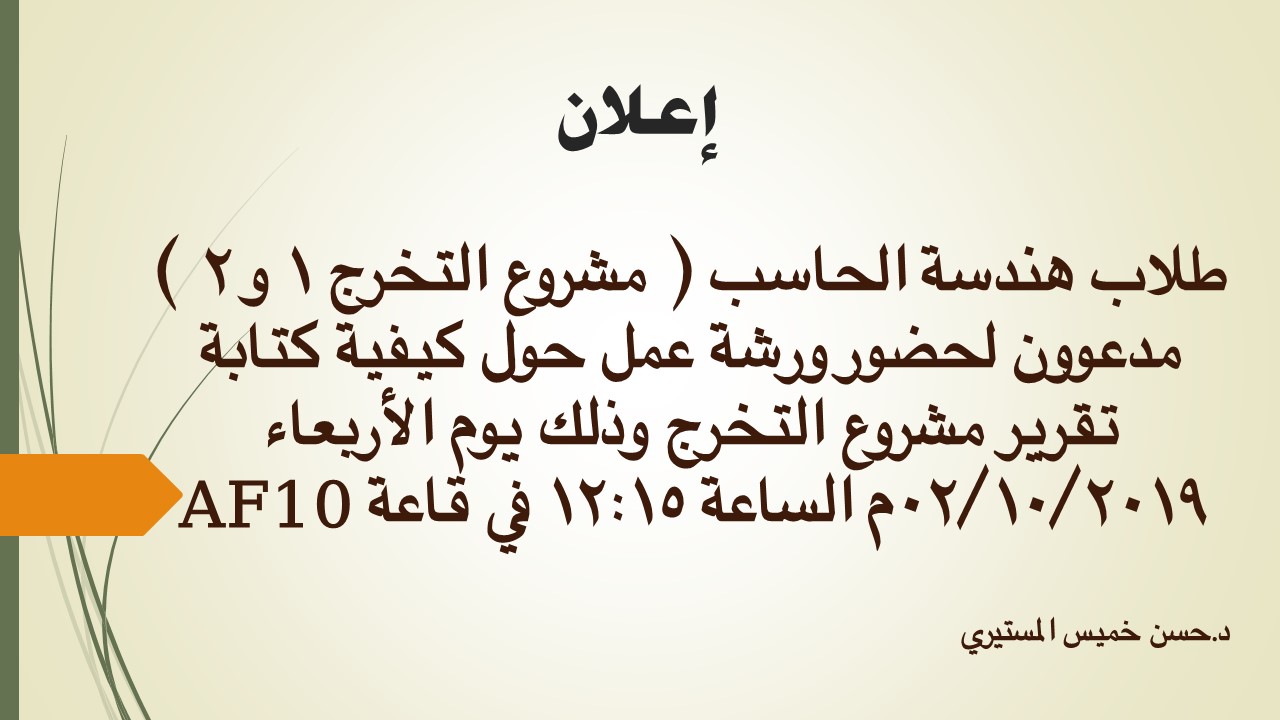 تنظم كلية هندسة وعلوم الحاسب بجامعة الأمير سطام بن عبدالعزيز لطلابها ورشة عمل بعنوان " كيفية كتابة تقرير مشروع التخرج" وذلك يوم غدً الأربعاء الموافق 3 / 2 / 1441هـ . حيث ستقام الورشة لطلاب قسم علوم الحاسب في تمام الساعة 12:00 ظهراً في قاعة رقم AS32 يلقيها الدكتور بلحسن عبدالحميد العكروت , فيما ستقام الورشة لطلاب قسم هندسة الحاسب في تمام الساعة 12:15 ظهراً في قاعة رقم AF10 يلقيها الدكتور حسن خميس المستيري . ويأتي الهدف من إقامة هذه الورشة من قبل الكلية لرفع كفاءة طلابها حيث ستتطرق الورشة إلى عدة محاور في جوانب كتابة تقرير مشروع التخرج التي من شأنها تفيد الطلاب , منها كيفية إختيار المشروع وأهميته وآلية كتابته وكيفية تصميم العرض التقديمي لمشروع التخرج وآلية توزيع درجات المشروع بالإضافة إلى دور المشرف على المشروع . حيث من المتوقع أن يكسب الطلاب المشاركين فيها المعارف والمهارات الأساسية اللازمة التي تمكنهم من كتابة مشاريع تخرجهم بكفاءة وفعالية عالية ليتمكنوا من النجاح في تحقيق أهدافهم .