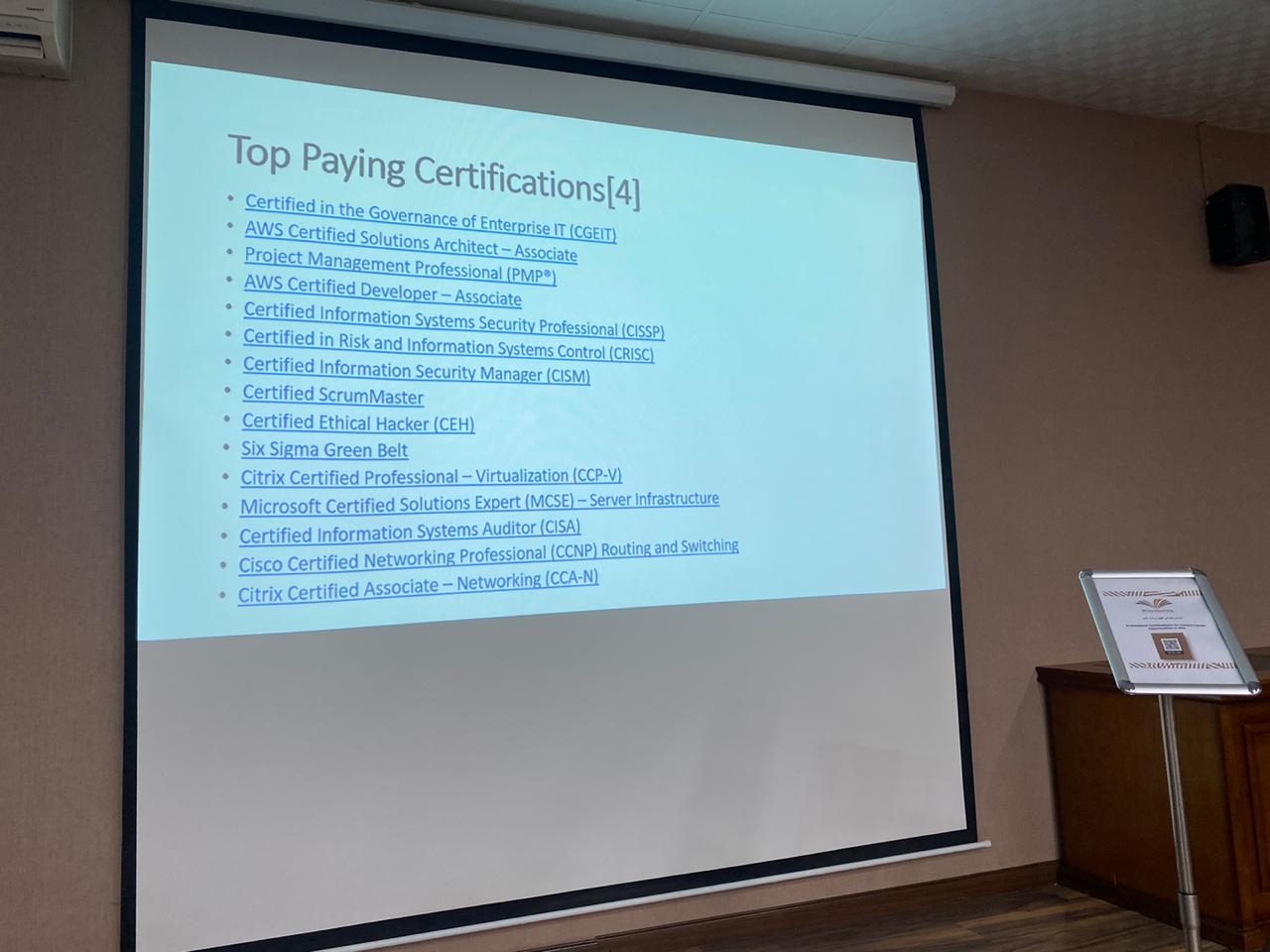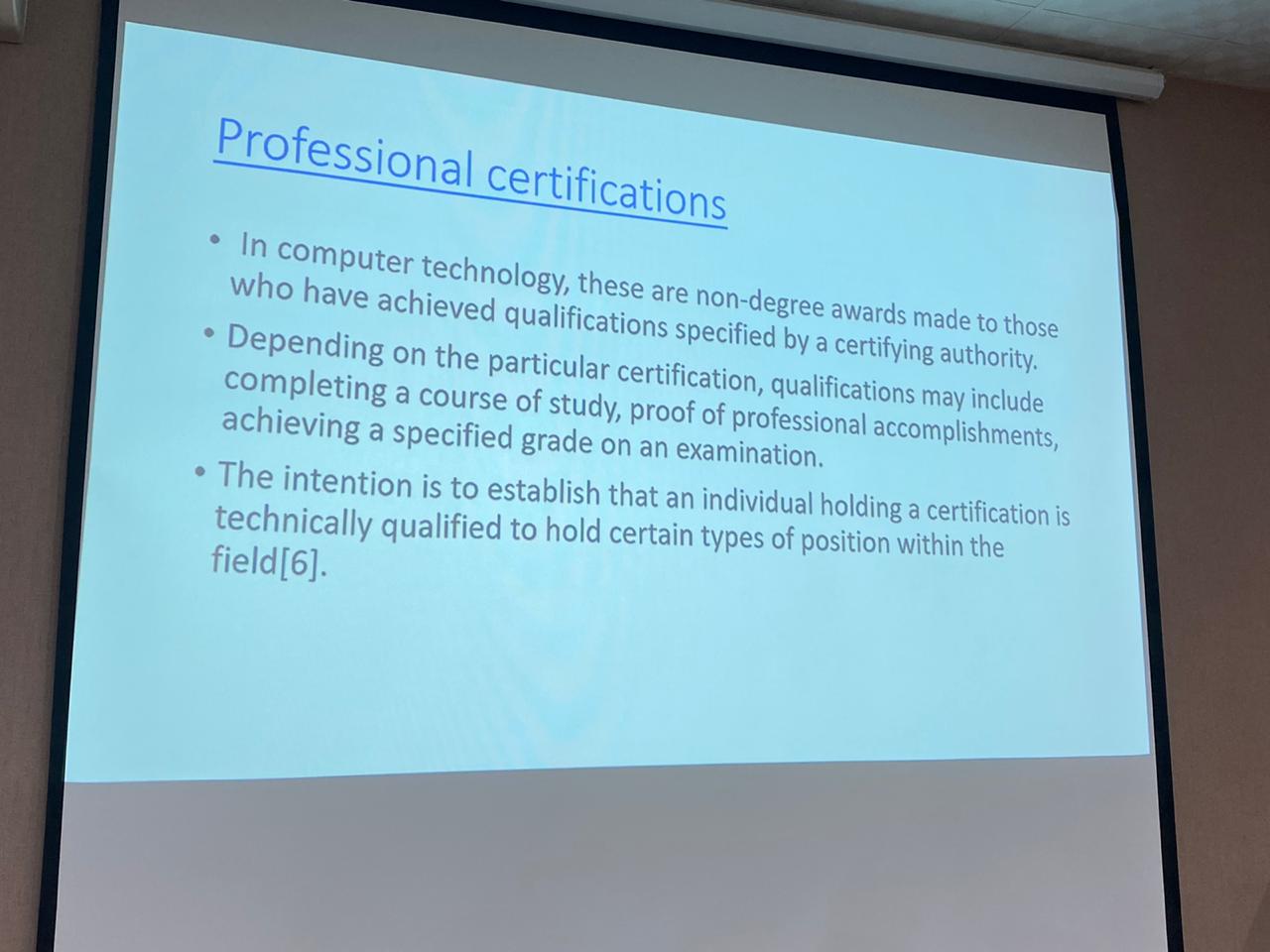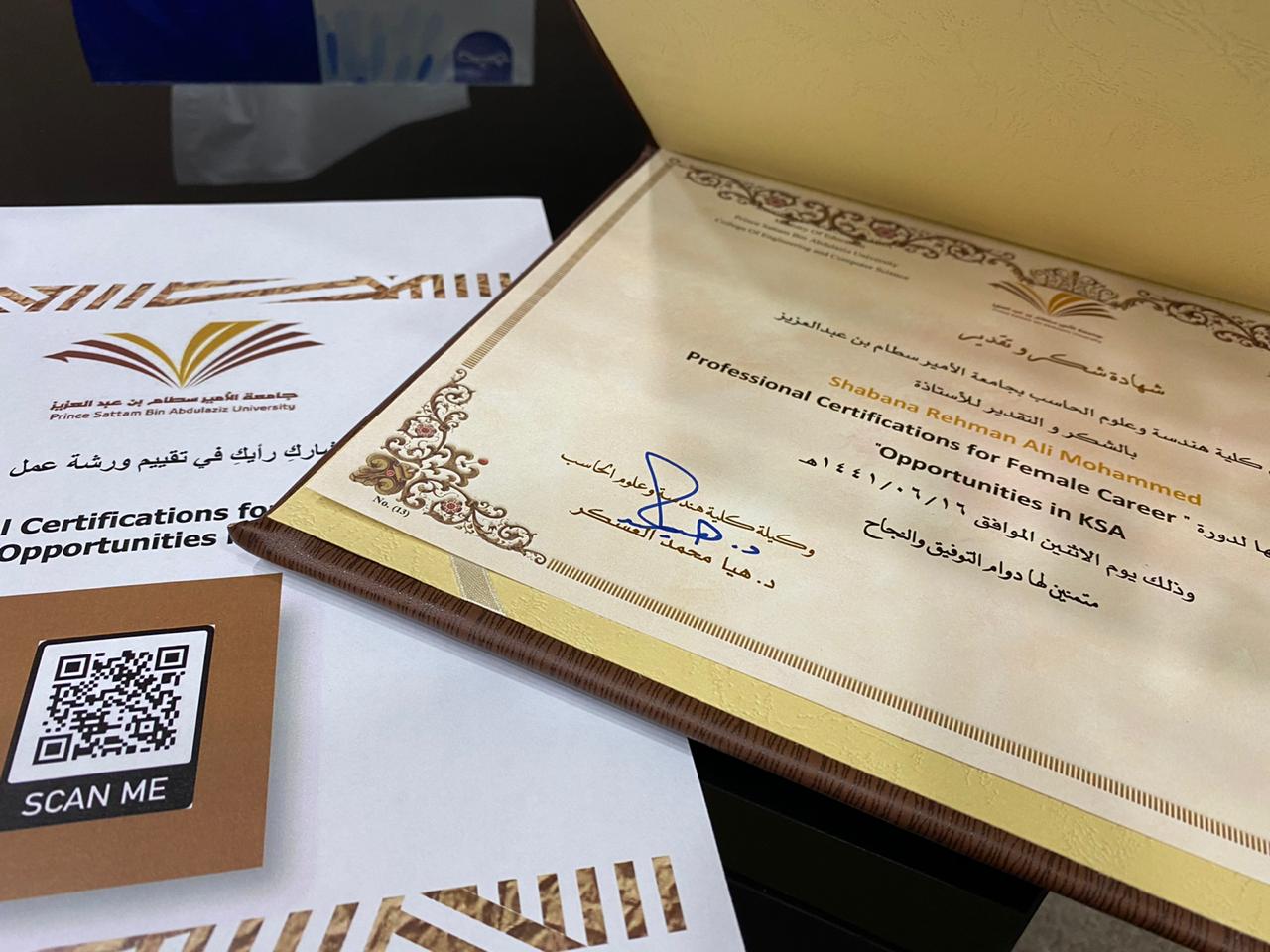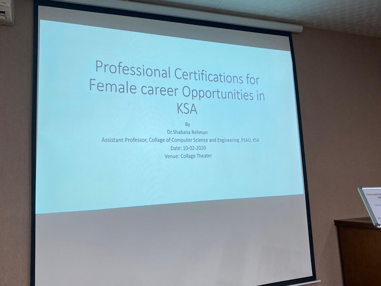نظمت وحدة الخريجات (التدريب المهني ) في كلية هنددسة و علوم الحاسب بالخرج يوم الأثنين الموافق 16-6-1441هـ ورشة عمل بعنوان ( professional certifications for female career opportunities in ksa ) قدمتها أ.شابانا زياد في مسرح الكلية الساعة 12م الى 1 م تستهدف الخريجات والمتوقع خروجهم لتزويدهم بمعلومات حول الفرص المهنية التي تساعدهم في معرفتهم له في المملكة العربية السعودية .