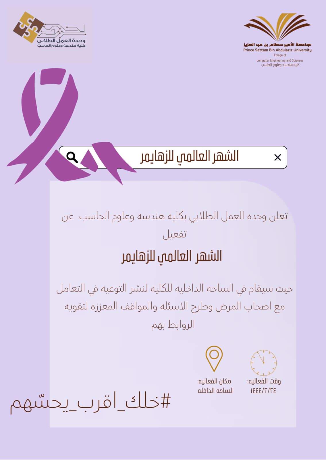 Coinciding with the World Alzheimer’s Month, which is activated by all member countries of the Alzheimer’s World Organization with the aim of spreading awareness of the disease, educating the community about its symptoms and effects, and how to reach care providers, and believing in the importance of keeping pace with the world’s most important developments and methods of treatment. On this basis, under the auspices of the leadership of the College of Engineering and Computer Science, the Director of Administration, Sana Al-Huwaishel, on behalf of the Vice Dean, Dr. Elham Kariri, the Student Work Unit at the College of Computer Science and Engineering organized its representative in cultural and social activities. And educational publications and distributions on Tuesday, September 20, the event aims to raise and disseminate public awareness of Alzheimer's disease by educating different segments of society about its symptoms, stages, and ways to prevent it.