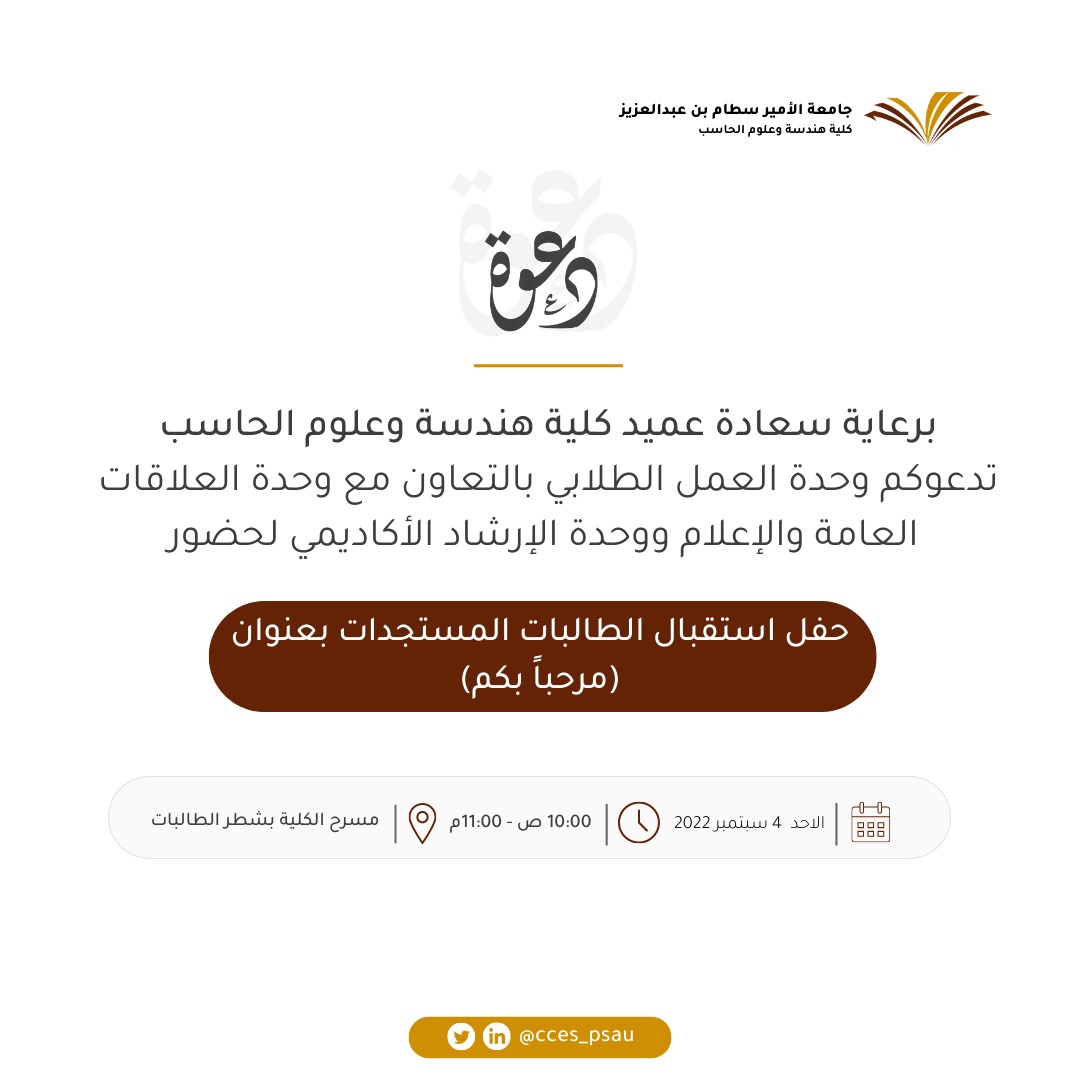 The supervisor of student work and director of the Guidance Office, Ms. Rafaa Al-Dosari, congratulated the new students for their admission to the College of Engineering and Computer Science, and wish to be a new beginning to build a better future and a happy life, God willing
