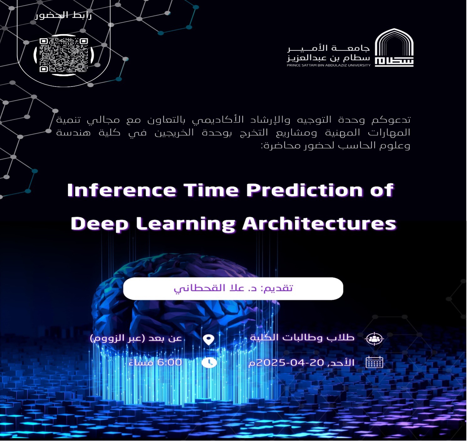 نظّمت وحدة التوجيه والارشاد الاكاديمي بالتعاون مع مجالي تنمية المهارات المهنيه و مشاريع التخرج بوحدة الخريجين في كلية الهندسة وعلوم الحاسب يوم الأحد الموافق 20 أبريل 2025، ورشة عمل بعنوان "Inference Time Prediction of Deep Learning Architectures" قدمتها الدكتورة علا القحطاني عن بعد وذلك لنشر المعرفة وتعزيز التوعية بالتقنيات الحديثة بين الطلاب والطالبات.